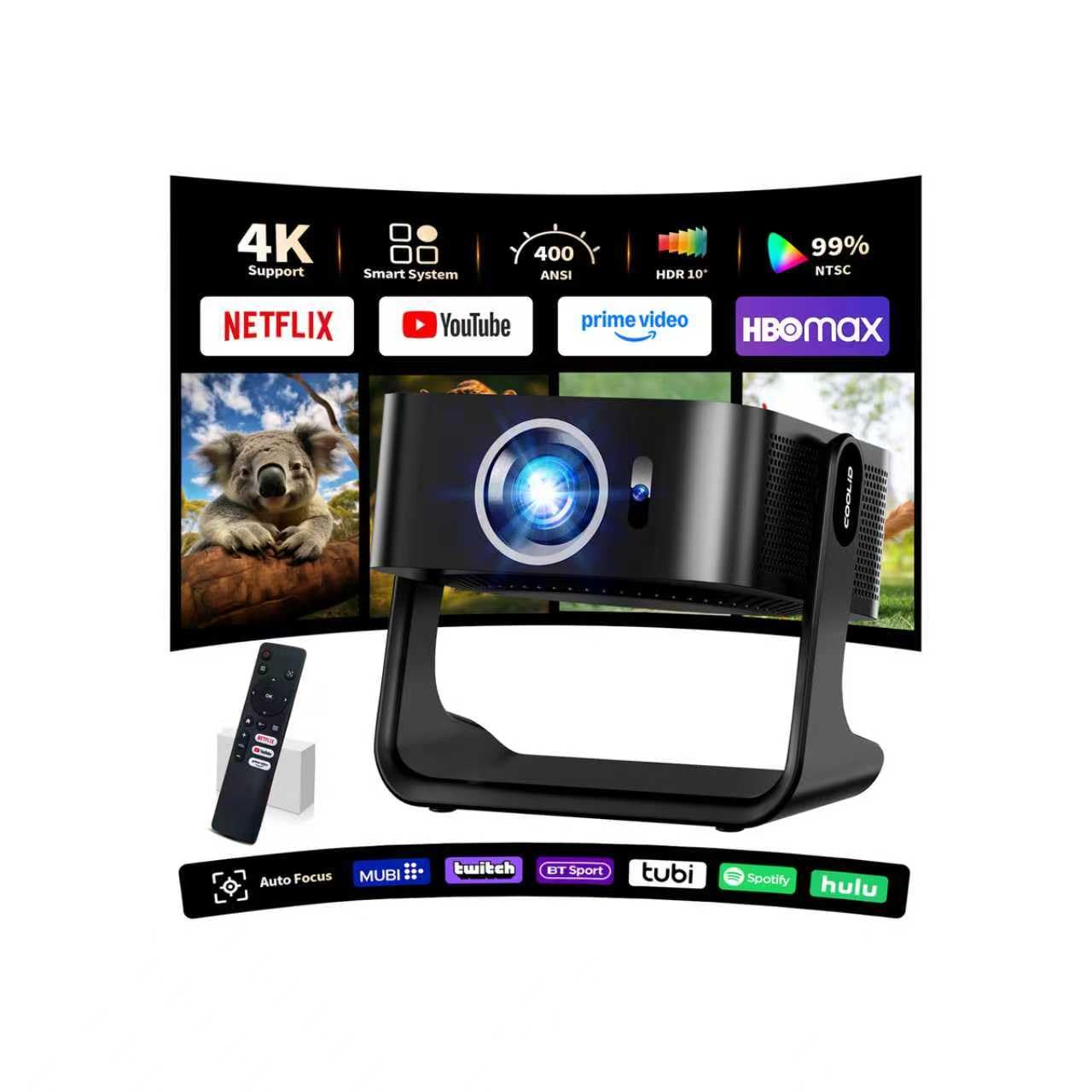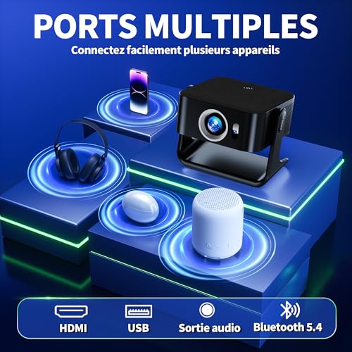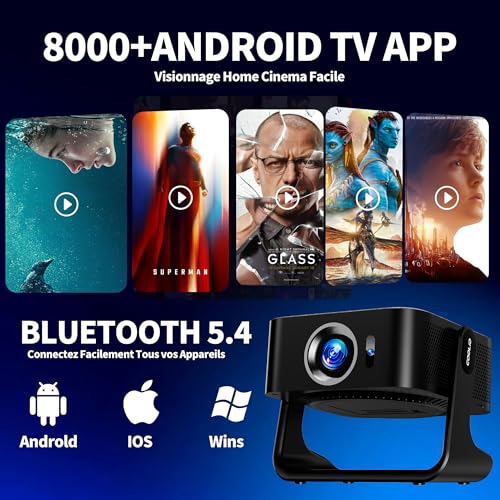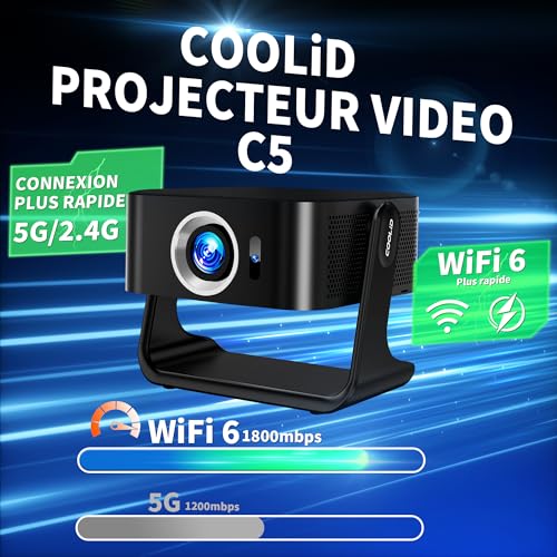 【Projecteur compatible avec Netflix】Prend en charge la projection vidéo 4K Ultra HD et intègre le système d’exploitation Android 13. À l’aide de la télécommande, vous pouvez accéder directement à toutes les applications telles que Netflix、YouTube ou Prime Video, ainsi qu’à plus de 20 millions de titres vidéo, sans avoir besoin de câbles HDMI, de clés TV ou de configurations complexes. Vous pouvez regarder immédiatement vos programmes et films préférés. 【Projection vidéo 1920*1080P et 4K】Le projecteur 4K offre une luminosité de 400 lumens ANSI et un décodage vidéo 4K, permettant de voir chaque détail de l’image projetée à l’écran avec une clarté cristalline.Sa résolution native est de 1920 × 1080P avec un rapport de contraste de 1000:1. Que ce soit à la maison, au camping ou au bureau, ce projecteur portable vous offre un plaisir maximal où que vous soyez.Pour utiliser la fonction de mise en miroir avec un Phone sur le projecteur C5, vous devez d’abord télécharger l’application de mise en miroir dans les paramètres du projecteur, puis redémarrer l’appareil avant d’utiliser la fonction de mise en miroir. 【Projecteur intelligent Mise au point automatique, correction trapézoïdale et détection d’obstacles】 Le projecteur intègre une puce intelligente dotée des dernières technologies en matière de mise au point automatique, de correction trapézoïdale automatique et de détection d’obstacles automatique. Il utilise l’intelligence artificielle pour capturer automatiquement les images sans nécessiter de réglage manuel. En seulement trois secondes, il capture avec précision l’image à l’écran et l’ajuste rapidement aux paramètres optimaux, offrant une projection rectangulaire nette. 【WiFi 6 et Bluetooth 5.4 bidirectionnel】 Le projecteur sans fil est équipé des technologies avancées WiFi 6 (2,4 GHz + 5 GHz) et Bluetooth 5.4 bidirectionnel, qui permettent une connexion rapide à vos téléphones mobiles, ordinateurs, systèmes audio, casques et autres appareils. De plus, le contenu des appareils peut être facilement synchronisé sur grand écran grâce aux fonctions de mise en miroir mobile ou de diffusion d’écran. La fonction de mise en miroir d’écran sans fil est compatible avec les appareils iOS, Android et Windows. 【Système de refroidissement intelligent Profitez d’images haute définition durables】Notre projecteur est équipé d’un ventilateur à deux vitesses et d’une technologie intelligente de détection de la température, qui surveille en permanence la température de l’appareil et ajuste automatiquement la vitesse du ventilateur pour assurer une dissipation efficace de la chaleur et un fonctionnement silencieux. Dites adieu aux ralentissements causés par la surchauffe et profitez d’une durée de vie prolongée de votre appareil. 【Support pivotant à 270°, projecteur flexible】Le mini projecteur portable est équipé d’un socle offrant une excellente stabilité et durabilité. Son boîtier pivote à 270°, ce qui vous permet de le fixer au mur ou au plafond, ou de le poser sur le sol ou une table pour la projection (pour une qualité d’image optimale, nous recommandons une taille de projection de 80 à 100 pouces). Prend en charge les sorties HDMI/USB/audio 3,5 mm/TF/AV.