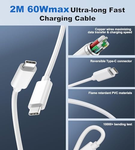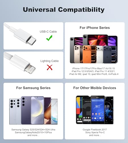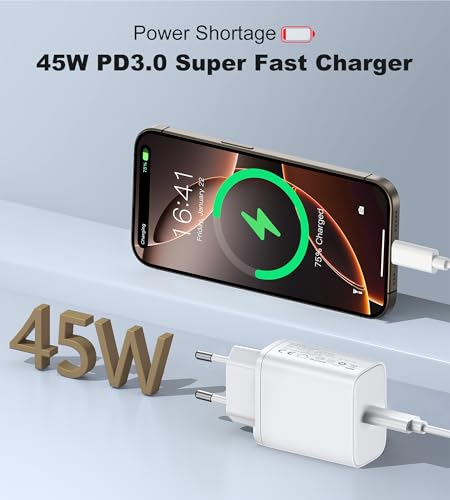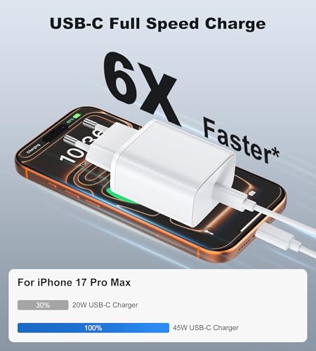 Chargeur pour la série for iPhone 17 : Conçu spécifiquement pour la série for iPhone 17, qui prend en charge la charge rapide 45W, notre chargeur USB c rapide 45W est une solution de charge à grande vitesse qui atteint 60 pour cent ou même plus rapidement en 30 minutes. Vous ne serez plus jamais lié à votre chargeur. CÂBLE EXTRA LONG DE 2 MÈTRES : Notre câble de charge pour for iPhone mesure 2 mètres de long, et le câble USB C vers USB C 60W offre une polyvalence inégalée pour tous vos besoins de charge. Grâce à sa longueur extra-longue, vous pouvez profiter d’une expérience de charge sans stress et sans contrainte d’espace. CHARGEUR DE SÉCURITÉ DE HAUTE QUALITÉ : Après de nombreux tests de certification en laboratoire, cette rapide prise USB C protège vos appareils contre les problèmes de court-circuit, de surintensité, de surtension et de surcharge. Assurez-vous que votre appareil est sûr et durable. MODÈLES COMPATIBLES : L’adaptateur secteur 45 W for iPhone peut charger l’iPhone 17/17 Air/17 Pro/17 Pro Max, l’iPhone 16/16 Plus/16 Pro Max, l’iPhone 15/15 Plus/15 Pro Max, le Samsung Galaxy S25/S24/S23/S22 Ultra-rapide, ainsi que l’iPad Pro/Mini 7,6 pouces et le Google et Mac Book Air, les téléphones portables dotés de ports de charge USB C. CE QUE VOUS OBTENEZ : Vous recevrez un adaptateur USB C 45W x1, un câble USB C vers USB C 2M (6Ft) x1, une garantie de 12 mois et une assistance à vie.