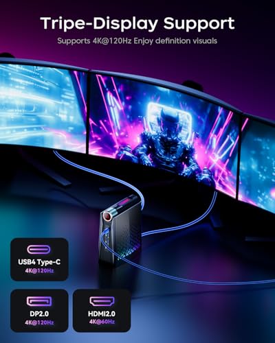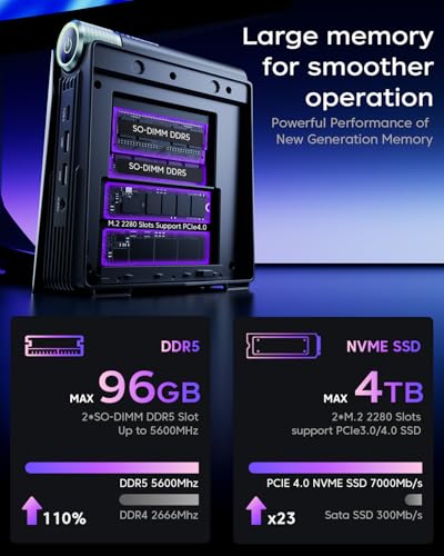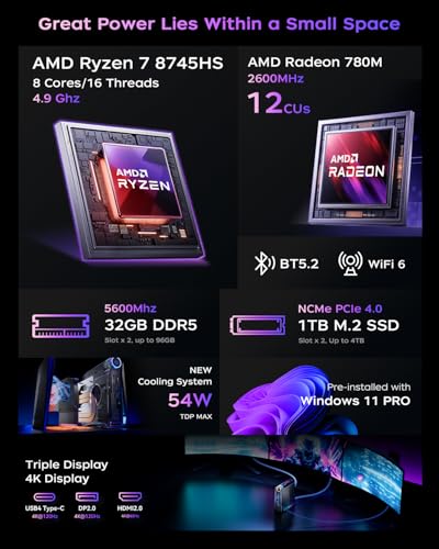 【AMD Ryzen 7 8745HS】 Le nouveau mini PC S3A – alimenté par AMD Ryzen 7 8745HS (architecture Zen 4 Advanced, 8 cores/16 threads, 16 Mo de cache) avec une fréquence de base de 3,8 GHz et une fréquence dynamique jusqu’à 4,9 GHz, et une carte graphique intégrée AMD Radeon 780M (12 cœurs, 2 600 MHz) – offre des performances comparables à celles d’un moniteur unique d’entrée de gamme moniteur, vous permettant de jouer aux jeux grand public sans avoir besoin d’une carte graphique supplémentaire ! Que ce soit pour l’édition vidéo (4K/8K), le rendu 3D ou le logiciel de conception à grande échelle, il est facile à gérer et multiplie l’efficacité 【AMD Radeon 780M】 Processeur graphique intégré très puissant ! Basée sur l’architecture innovante RDNA 3 et avec des fréquences allant jusqu’à 2600 MHz, elle garantit d’excellentes performances de jeu dans le miniPC AM08 Pro sur la majorité des titres. Il offre une fréquence d’images jusqu’à 8 fois supérieure à celle des anciens GPU Vega et dépasse de plus de 50 % les graphiques Iris Xe des processeurs Intel de 12e génération en benchmark tels que 3DMark et Superposition. Cette puissance graphique exceptionnelle, comparable à des cartes discrètes d’entrée de gamme, révolutionne l’expérience dans les minipcs 【 Mémoire large et extensible 】 32 Go de RAM DDR5 et 1 To de mémoire SSD. Doté d’une mémoire DDR5 à double canal (mise à jour jusqu’à 64 Go) avec une fréquence maximale de 4800 MHz, la mémoire est très rapide tant en termes de vitesse de lecture que d’écriture. Un SSD M.2 2280 NVMe PCIe3.0×4 de 1 To est livré en série, avec possibilité d’ajouter des disques SSD pour étendre la mémoire (jusqu’à 4 To). Cette configuration de mémoire est idéale pour les tâches nécessitant de grandes quantités de mémoire et un stockage rapide. Le mini mainframe S3A peut augmenter l’efficacité et la productivité. 【 Satisfaire des besoins différents 】 Ce mini PC a trois modes qui peuvent être ajustés. ① Mode silencieux (35 W), le son du ventilateur est faible jusqu’à 35 dB, pour un travail léger et silencieux. ②Mode Auto (45W), adapté aux projets de travail ou de divertissement de moyenne entité, pour améliorer l’efficacité de travail ; ③Mode Performance (54W), pour améliorer l’expérience de jeu. Les effets lumineux RGB réglables inspirent votre enthousiasme de jeu ! Système de refroidissement efficace : la nouvelle génération de mini PC de jeu S3A adopte un ventilateur centrifuge silencieux à haute vitesse, qui réduit le bruit du ventilateur tout en augmentant la zone de refroidissement ; la structure interne entièrement en cuivre avec tôle de cuivre + plaque de cuivre + ailettes de cuivre augmente la conductivité thermique du module de refroidissement ; la conception à double sortie d’air garantit une dissipation de la chaleur plus efficace pour répondre aux besoins des jeux qui doivent être utilisé avec une consommation d’énergie élevée ! En outre, le SSD est refroidi par de grandes ailettes en aluminium, qui garantissent la température et la vitesse de lecture du SSD. 【S3A – Le roi de la vitesse】Doté d’un port réseau adaptatif 10/100/1000 Mbps/2,5 Gbps, il prend en charge une vitesse maximale de transfert de données de 2500 Mbps, 2,5 fois plus rapide qu’un ordinateur hôte normal doté du réseau Gigabit. Le Mini PC peut ouvrir immédiatement les pages Web, télécharger rapidement les fichiers et regarder des vidéos avec moins d’attentes et moins de mise en tampon. Doté de WiFi 6 et Bluetooth 5.2 pour un transfert de données plus rapide et une couverture plus large, la connexion avec les appareils Bluetooth sera plus fluide et stable. De plus, le Mini PC prend également en charge le Wake-on-Web et le démarrage automatique. 【Interfaces multiples】Port USB 3.2 Gen2 Type-A x 2 (10 Gbps, interface frontale), port USB 3.2 Gen1 Type-A x 4 (5 Gbps, interface arrière), 1 x LAN (10/100/1000 Mbps/2,5 Gbps Adaptive), 1 x jack audio 3,5 mm, 1 x port DC 1 x HDMI, 1 x DP, 1 x Type-C [Support DP1.4, 4 K à 60 Hz, transfert de données max. 10 Gbps, sortie PD, prise en charge de la sortie à triple écran 4K à 60 Hz, pour offrir une qualité d’image claire et garantir une plus grande efficacité de travail.