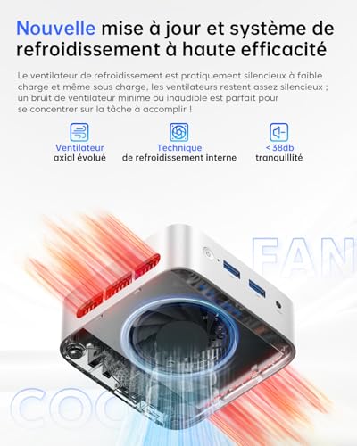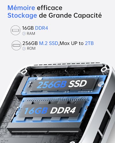 🔹[CPU : N95] – Le Mini PC V1 est équipé du tout nouveau processeur Alder Lake-N Ν95 (4 cœurs/4 threads, 6 Mo de cache Intel Smart, jusqu’à 3,6 GHz). Avec une remarquable efficacité énergétique de 15 W, il surpasse ses prédécesseurs et rivalise même avec certains processeurs mobiles courants du passé. Que ce soit pour le travail, le divertissement familial, l’école ou les réseaux sociaux, ce Mini PC répond à tous vos besoins ! 🔹[Grande capacité de stockage, extension facile] – L’ordinateur Mini V1 de la série Vista est équipé de 16 Go de DDR4 et d’un SSD M.2 2280 de 256 Go, permettant à ce petit PC d’exécuter plusieurs opérations à haute performance simultanément. Ce micro-ordinateur professionnel offre des capacités de lecture, d’écriture et de stockage rapide, garantissant un fonctionnement fluide des applications. Si vous avez besoin de plus d’espace, vous pouvez également ajouter un SSD M.2 NVMe PCIe 3.0 ou un SSD M.2 SATA pour étendre le stockage jusqu’à 2 To. Vous pouvez ainsi stocker et accéder facilement à une grande quantité de fichiers et de données. 🔹[Système W11 Pro & connectivité polyvalente] – Le Mini PC de bureau est préinstallé avec le système Win11 Pro, qui est intelligent, sécurisé et efficace. Il propose plusieurs interfaces : 1 port Ethernet RJ45 Gigabit 10M/100M/1000M, 2 ports USB3.2 Type-A, 2 ports USB2.0 Type-A, 1 HDMI 2.0, 1 DP 1.4, 1 DC IN, et 1 prise audio 3,5 mm. Ces connexions polyvalentes offrent une grande flexibilité pour vos appareils. 🔹[Nouvelle mise à jour] – Le Mini PC portable possède un boîtier argenté et peut être facilement rangé dans un sac, idéal pour les voyages d’affaires. Il économise de l’espace grâce à sa taille ultra-minimale (3,9 x 3,9 x 1,3 pouces) et à un support VESA pour installation sur des murs ou des moniteurs. La forme du V1 a récemment été améliorée pour optimiser le dissipation de chaleur, permettant un fonctionnement continu et stable du Mini PC. Le ventilateur de refroidissement est pratiquement silencieux à faible charge et reste relativement silencieux même sous charge; un bruit de ventilateur minimal ou inaudible est parfait pour se concentrer sur la tâche ! 🔹[WiFi & Bluetooth – Compatibilité facile] – Le Mini PC ACE offre une connexion sans fil fiable et stable, ouvre des sites web en quelques secondes, diffuse des films sans buffering et télécharge des fichiers en douceur. Le Bluetooth intégré permet de connecter plusieurs appareils sans fil tels que souris, claviers, casques, caméras de surveillance, imprimantes, moniteurs, téléviseurs, etc. La technologie de connexion sans fil haute vitesse garantit une vitesse de transmission fiable et efficace, offrant une expérience Internet plus rapide lors de la navigation et du streaming. 🔹[Contenu du paquet] – Le Mini PC de bureau V1 peut effectuer des réglages BIOS dans le système d’exploitation, tels que l’activation automatique, le Wake on LAN, et plus encore. Contenu de l’emballage : 1 x Mini PC, 1 x adaptateur secteur, 1 x câble HDMI, 1 x kit de montage, 1 x manuel d’utilisation.