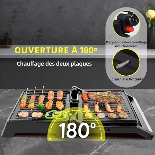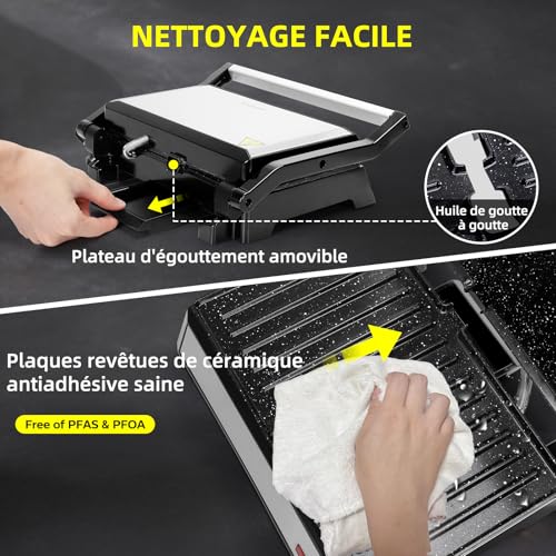 【Chauffage rapide et uniforme】La puissance de 1000 W et la structure interne améliorée permettent un préchauffage rapide. Idéal pour des matins pressés ou des dîners express, ce toaster panini assure une distribution de chaleur uniforme pour des résultats de cuisson parfaits à chaque utilisation. 【Ouverture à 180° & utilisation intuitive】L’ouverture à 180° permet un accès total aux deux surfaces de cuisson. La chaleur est uniformément répartie pour cuire plusieurs aliments en même temps, rapidement. Des témoins lumineux vous guident : vert (préchauffage), rouge (prêt à cuire). Idéal pour enchaîner les croque-monsieur et les paninis. 【Plaques Anti-adhésives & Faciles à Nettoyer】Les plaques recouvertes d’un revêtement anti-adhésif de haute qualité empêchent les aliments de coller. Pour nettoyer, laissez refroidir, essuyez les résidus avec une serviette en papier, puis passez un chiffon humide. 【Multifonction】Ce toaster panini sert également de gril et de sandwich maker. Idéal pour préparer des croque monsieur, des paninis, des légumes grillés, des omelettes ou même de la viande. Parfait pour préparer facilement des petits déjeuners, des dîners ou pour un apéritif dînatoire. 【Design Compact & Gain de Place Optimal】Avec ses dimensions compactes (27,7 x 22,3 x 9,3 cm), il se range facilement. Le compartiment intégré pour rangement du cordon et le verrou de sécurité permettent un stockage en toute sécurité dans un placard. Une conception qui s’intègre parfaitement dans toute cuisine.