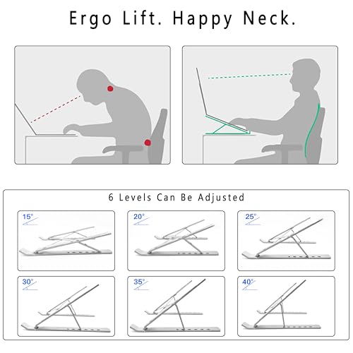 【Support pc Portable – Réglage à 6 Vitesses】 Vous pouvez régler la hauteur et l’angle confortables, conçus de manière ergonomique, faciles à regarder et à taper, tout en corrigeant la posture assise, en réduisant la fatigue du cou ou les maux de dos. 【Matériel – Alliage D’aluminium】 Support ordinateur portable est fabriqué en alliage d’aluminium épaissi de haute qualité, de sorte que le support est ferme et stable, et il peut supporter le poids de l’ordinateur plus fermement. 【4 Patins en Caoutchouc Antidérapants】 Le support pour ordinateur portable glisse vers le bas et les quatre patins en caoutchouc antidérapants au bas du support peuvent mieux vous protéger contre les glissades lorsque vous utilisez le support d’ordinateur sur le bureau. 【Support pour Ordinateur Portable – Ventilation et Dissipation de la Chaleur】 Le support pour ordinateur portable en alliage d’aluminium a une conception creuse en bas, et la conception de ventilation ouverte en bas offre une meilleure dissipation de la chaleur de l’ordinateur. 【Ordinateurs Portables de Différentes Tailles】Support pc portable convient à tous les ordinateurs portables de 8 à 16 pouces, facile à ranger et prend très peu de place; Pratique à transporter, vous pouvez le mettre dans un sac à dos ou un sac.