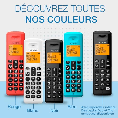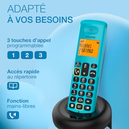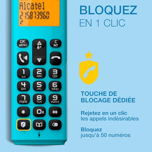 GRAND ÉCRAN PRATIQUE : Le téléphone fixe sans fil Alcatel E260 au design compact dispose d’un grand écran rétroéclairé à 2 lignes qui affiche le nom et le numéro de vos contacts sur fond orange. Compatible avec box internet multiopérateurs. FONCTION MAINS LIBRES : Ce téléphone sans fil inclut une fonction mains libres avec haut-parleur pour vous permettre de continuer vos conversations tout en vaquant à vos occupations, sans tenir le combiné. STOCKEZ JUSQU’À 50 CONTACTS : Ce téléphone peut stocker jusqu’à 50 contacts et garder une trace des 20 derniers appels. Accès rapide à trois numéros mémorisés via les touches 1, 2 et 3. BLOQUEZ LES NUMÉROS INDÉSIRABLES : Le téléphone fixe Alcatel E260 offre une fonction de blocage d’appels facile grâce à une touche dédiée, permettant de bloquer jusqu’à 50 numéros pour une tranquilité assurée. LEADER DE LA TÉLÉPHONIE : Marque d’origine française spécialisée dans les télécommunications, Alcatel est l’un des leaders mondiaux dans le domaine de la téléphonie.