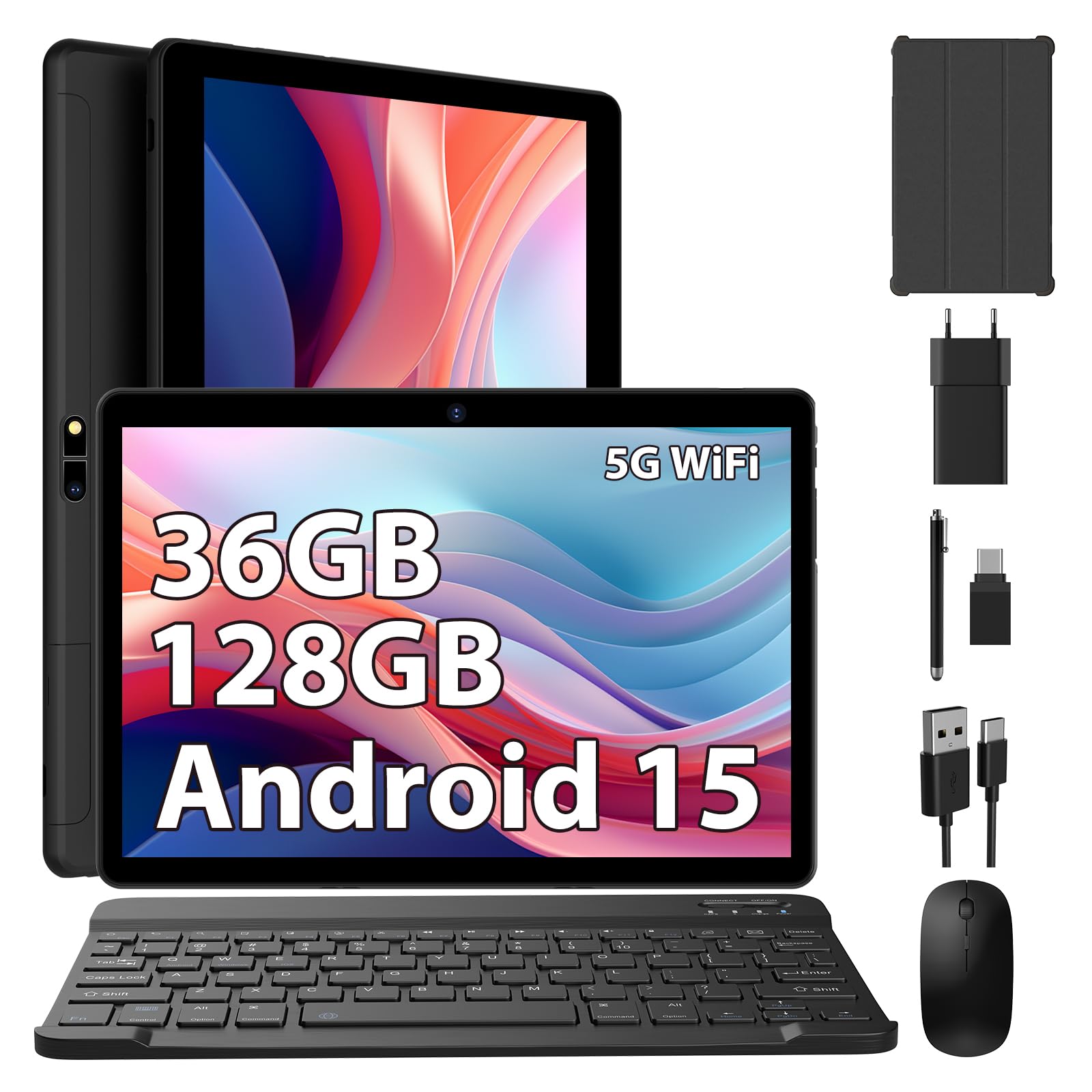 Android 15 Tablette 10 Pouces tablettes tactiles 5G WiFi,36Go RAM +128 Go ROM,8000 mAh,Smart IPS,Bluetooth5.0,Tablette avec Clavier avec/Souris/Stylo,Nero