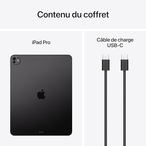 POURQUOI L’IPAD PRO — L’iPad Pro offre l’expérience iPad ultime dans un design incroyablement fin et léger. Avec l’extraordinaire écran Ultra Retina XDR, les performances hors normes de la puce M4, une connectivité sans fil ultra-rapide* et la compatibilité avec l’Apple Pencil Pro*. Sans oublier les puissantes fonctionnalités de productivité d’iPadOS. ÉCRAN ULTRA RETINA XDR 13 POUCES — L’écran Ultra Retina XDR offre une luminosité et un contraste extrêmes ainsi qu’une exceptionnelle précision de la couleur et il intègre des technologies avancées comme ProMotion, une large gamme de couleurs P3 et True Tone*. En plus, une option de verre d’écran nano-texturé est disponible pour les configurations 1 To et 2 To. PERFORMANCES ET STOCKAGE – Le CPU jusqu’à 10 cœurs de la puce M4 livre une puissance exceptionnelle et son GPU 10 cœurs, des performances graphiques fulgurantes. Et avec une autonomie d’une journée, le potentiel de l’iPad Pro ne connaît aucune limite*. Profitez d’un stockage pouvant atteindre 2 To pour conserver tout ce que vous voulez : apps ou fichiers volumineux comme des vidéos 4K*. IPADOS + APPS – iPadOS fait de l’iPad un outil plus productif, polyvalent et intuitif. Avec iPadOS, exécutez plusieurs apps à la fois, utilisez l’Apple Pencil pour écrire dans n’importe quelle zone de texte avec Griffonner, retouchez vos photos et partagez-les*. Stage Manager facilite le multitâche en vous permettant de redimensionner et de superposer vos apps et d’ajouter un écran externe. L’iPad Pro intègre des apps incontournables comme Safari, Messages et Keynote, et plus d’un million d’autres apps vous attendent sur l’App Store. APPLE PENCIL ET MAGIC KEYBOARD POUR IPAD PRO – Grâce à l’Apple Pencil Pro, l’iPad Pro devient un outil de création immersif et le meilleur support de prise de notes qui soit. L’Apple Pencil (USB-C) est également compatible avec l’iPad Pro. Le Magic Keyboard pour iPad Pro, au design fin et léger, vous offre un excellent confort de frappe, intègre un trackpad en verre avec retour haptique et sert de protection à votre iPad*. APPAREIL PHOTO ET CAMÉRA AVANCÉS – L’iPad Pro est doté d’une caméra avant ultra grandangle 12 Mpx horizontale avec Cadre centré, idéale pour les visioconférences et les selfies en mode Portrait. De son côté, l’appareil photo arrière grand-angle 12 Mpx avec flash True Tone adaptatif est parfait pour la photo et la vidéo 4K avec prise en charge du format ProRes. Quatre micros de qualité studio et un système audio à quatre haut-parleurs produisent un son riche. Et le scanner LiDAR améliore encore vos expériences de réalité augmentée en créant une carte de profondeur de l’endroit où vous vous trouvez. CONNECTIVITÉ – Le Wi-Fi 6E vous offre une connectivité sans fil rapide qui accélère le transfert de vos photos, documents et fichiers vidéo volumineux. Et quand vous n’avez pas accès au WiFi, la connectivité 5G ultra-rapide vous permet de garder le contact dans de nombreux endroits*. Connectez des écrans externes, des disques durs et d’autres appareils via le connecteur USBC avec prise en charge de Thunderbolt/USB 4. DÉVERROUILLAGE ET PAIEMENT AVEC FACE ID – D’un simple regard, déverrouillez votre iPad Pro, authentifiez-vous pour effectuer des achats sécurisés, connectez-vous à vos apps et faites bien plus encore*. * MENTIONS LÉGALES – Ceci est un résumé des caractéristiques principales du produit. Voir ci-dessous pour en savoir plus.