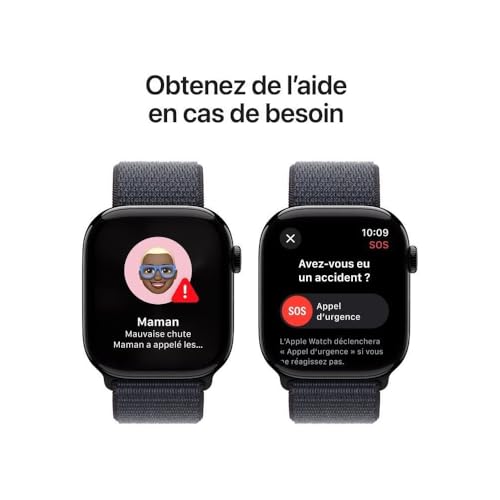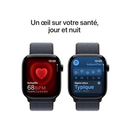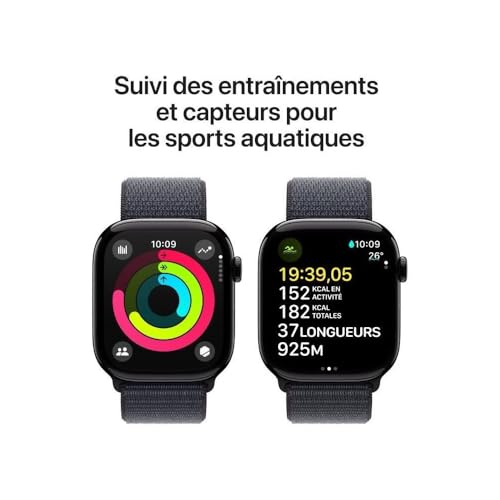 POURQUOI L’APPLE WATCH SERIES 10 – Un plus grand écran avec jusqu’à 30 % de surface d’affichage supplémentaire*. Un design plus fin, plus léger et plus confortable*. Des fonctionnalités avancées de santé et de forme avec des infos précieuses*. Des fonctionnalités de sécurité pour vous mettre en relation avec les services d’urgence*. Une charge plus rapide avec 80 % de batterie en 30 minutes environ*. DONNÉES DE SANTÉ AVANCÉES – Faites un électrocardiogramme à tout moment*. Recevez des notifications en cas de fréquence cardiaque élevée ou faible, ou en cas d’arythmie*. Comprenez mieux votre cycle menstruel et bénéficiez d’estimations d’ovulation rétrospectives*. Consultez votre fréquence cardiaque, votre fréquence respiratoire et autres infos dans l’app Signes vitaux*. Suivez votre sommeil et recevez des notifications de votre Apple Watch en cas de signes d’apnée du sommeil.* UNE PUISSANTE PARTENAIRE DE SPORT – Suivez votre activité physique avec les anneaux Activité, à personnaliser selon votre style de vie. Bénéficiez de données avancées pour une large gamme d’entraînements dans l’app Exercice*. Mesurez l’intensité de vos activités physiques grâce à la charge d’entraînement. Utilisez les nouveaux profondimètre et capteur de température de l’eau pour vos activités aquatiques. Et bénéficiez de trois mois d’abonnement gratuit à Apple Fitness+ grâce à votre Apple Watch*. GARDEZ LE CONTACT – Envoyez un message, passez un appel, écoutez de la musique et des podcasts, utilisez Siri et recevez vos notifications, où que vous soyez. L’Apple Watch Series 10 (GPS) fonctionne avec votre iPhone ou un réseau Wi-Fi pour vous permettre de garder le contact. FONCTIONNALITÉS DE SÉCURITÉ INNOVANTES – Les fonctionnalités Détection des chutes et Détection des accidents peuvent vous mettre automatiquement en relation avec les secours en cas de mauvaise chute ou de grave accident de voiture. Appel d’urgence vous permet d’appeler les secours en appuyant simplement sur un bouton*. La fonctionnalité Accompagnement informe automatiquement vos proches lorsque vous arrivez à destination. INCROYABLE RÉSISTANCE – Résistance aux chutes et à la poussière (indice de protection IP6X). Résistance à l’eau jusqu’à 50 m*. NEUTRALITÉ CARBONE – L’Apple Watch Series 10 est neutre en carbone lorsqu’elle est associée à certains bracelets. Consultez apple.com/fr/2030 pour en savoir plus sur l’engagement d’Apple en faveur de l’environnement. COMPATIBLE, TOUT SIMPLEMENT – Elle fonctionne sans problème avec vos appareils et services Apple*. Déverrouillez automatiquement votre Mac. Avec la fonctionnalité Localisation précise prise en charge sur certains modèles d’iPhone, consultez la distance approximative et la direction dans laquelle se trouve votre iPhone*. Payez avec Apple Pay. FACILE À PERSONNALISER – Avec des bracelets dans toute une variété de styles, de matériaux et de couleurs, et des cadrans entièrement personnalisables, vous pouvez adapter votre montre à votre humeur ou au moment de la journée. * MENTIONS LÉGALES – Ceci est un résumé des caractéristiques principales du produit.