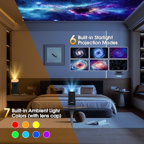 【Mode D’étoile et Lumière Ambiante】Le projecteur X3 simule les effets dynamiques de la Voie lactée avec 6 modes de projection galactique fascinants pour une ambiance romantique ou une relaxation méditative. Accompagné de 7 couleurs de lumière ambiante réglables pour transformer n’importe quel espace et créer une atmosphère cinématographique pour la détente, les fêtes ou les soirées romantiques. 【Système d’Exploitation Intelligent Intégré】Le projecteur X3 est doté du système d’exploitation intelligent Android TV avec des applications telles que YouTube, Spotify et Video, vous permettant d’accéder en un clic à des millions de vidéos dans des applications qui transforment le projecteur en un hub de divertissement tout-en-un. 【Native 1080P / 4K Support】Le projecteur X3 prend en charge la lecture vidéo 4K. Les vidéos 4K seront lues en résolution 1080P avec la dernière technologie de couleur NTSC, qui améliore le contraste des couleurs et reproduit fidèlement les détails de l’image, vous donnant des vidéos et des images vives, réalistes et colorées. 【Dernière WiFi6 + Bluetooth 5.2】Le projecteur est équipé de la dernière technologie WiFi6. Comparé au réseau 2.4G, il est plus rapide, avec un transfert de contenu plus fluide et plus stable et une latence plus faible. En outre, le projecteur est équipé de haut-parleurs stéréo intégrés et le Bluetooth 5.2 facilite la connexion du projecteur avec des écouteurs, des haut-parleurs et d’autres appareils. Créez une expérience de cinéma à domicile pour vous et votre famille, à tout moment et en tout lieu. 【Correction Automatique du Trapèze】Le projecteur est équipé d’une fonction de correction automatique du trapèze. Il projette des images rectangulaires quelle que soit la manière dont il est installé. Ce projecteur portable offre des tailles de projection de 39” à 200” et des distances de projection de 4” à 25” , vous offre un visionnage optimal dans votre home cinéma. 【Large Compatibilité】Le projecteur est compatible avec IOS et Android pour la projection d’écran sans fil. Compatible con HDMI pour la projection d’écran entre l’ordinateur portable et le projecteur. L’appareil comprend un port HDMI, un port USB et une prise casque de 3,5 mm. Se connecte à TV Stick, iPhone, téléphones cellulaires Android, tablettes, Laptop, USB et plus encore. Adopte le principe de l’image à réflexion diffuse. Il peut mieux filtrer la lumière bleue et protéger vos yeux.
