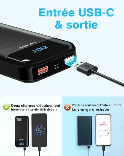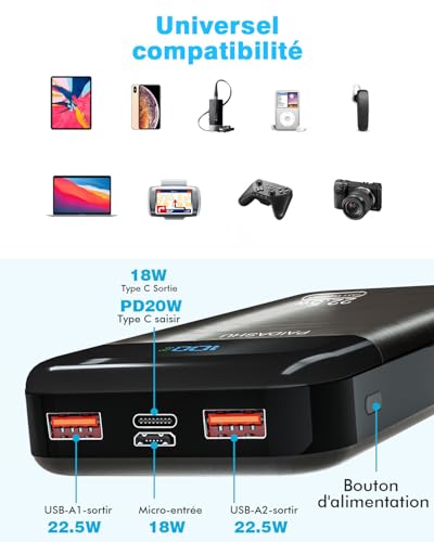 La Dernière Technologie de Charge Rapide de 22,5 W: le dernier SuperChargeProtocol, FastChargerProtocol; Avec la puissance améliorée de 22,5 W et la dernière technologie de charge rapide PD3.0 et QC4.0, votre téléphone peut être chargé de 0 % à 52 % en seulement 25 minutes. Trois fois plus rapide que l’ancienne batterie externe portable de 10 W 3 Sorties et 2 Entrées: notre banque d’alimentation USB-C est conçue avec 3 sorties (sortie USB A1/A2 + USB-C), vous pouvez charger 3 appareils en même temps et vous n’avez pas à vous soucier de la perte de vitesse; et 2 entrées (Micro USB + USB C), vous pouvez charger votre batterie externe de manière très flexible Grande Capacité: la banque d’alimentation de grande capacité peut charger votre téléphone 13 Pro plus de 5 fois, charger OnePlus 10 Pro 2,7 fois, une capacité de batterie suffisante peut répondre à votre court voyage, voyage d’affaires, camping, alpinisme, répondre aux besoins d’urgence et autres Affichage LED Précis et Intelligent: grâce à la conception de l’écran LED, vous pouvez connaître la puissance exacte de la batterie et plus besoin de deviner. La puissance restante est claire en un coup d’œil et la gestion de l’alimentation est plus pratique. afin que vous puissiez connaître le niveau de batterie restant à tout moment Ce que vous obtenez: une banque d’alimentation , un câble USB-A vers USB-C, un sac d’emballage en plastique CPE, un manuel d’utilisation. soutenu par une garantie de 1 ans à la pointe de l’industrie Signaler