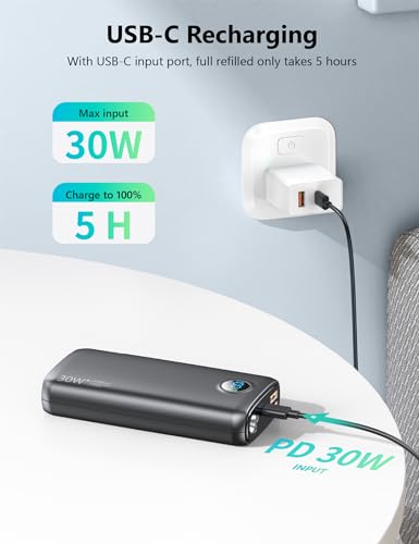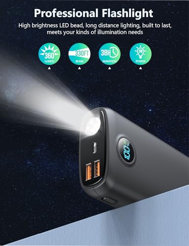 Professionnelle et Puissante Batterie Externe: Nous utilisons des matériaux de batterie Li-Polymère de qualité supérieure pour produire ce power bank, la grande capacité de 27000mAh peut vous fournir 2 à 3 jours d’énergie, charger complètement la plupart des téléphones portables 3 à 4 fois, et peut être emportée en avion pour les voyages. Charge Rapide Protocole: Le USB-C offre une puissance de sortie de 30W, ce qui vous permet de recharger votre iPhone 16 Pro de 0% à 100% en seulement 55 minutes. Le port USB-A à recharge rapide, avec une vitesse de 22.5W, peut recharger la plupart des smartphones à 100% en moins d’une heure. Le port USB-A peut recharger le Galaxy S22 Ultra à 50% en 35 minutes. Lampe de Poche Lumineuse: Ce chargeur externe est équipé d’une perle LED 3W 360 Lumen, appuyez longuement sur le bouton, la lampe de poche s’allume. Idéale pour le camping en plein air, la marche de nuit, la réparation de voiture, le travail en intérieur. C’est un bon choix si les autres outils d’éclairage s’épuisent dans l’obscurité. Protection Multiple: La puce intelligente installée protège le chargeur portable contre les surcharges, les décharges excessives, les surtensions, les surintensités, les courts-circuits et les surchauffes. Adaptation de la coque PC anti-rayures, petite taille et poids adapté, facile à transporter. Moins de Temps pour Recharger: À travers l’adaptateur 30W et au câble de recharge, le port USB C ne nécessite que 5 heures pour recharger cette batterie externe. Grâce à l’écran numérique LED, vous pouvez clairement connaître la puissance restante, recharger immédiatement cette batterie externe et alimenter vos appareils électroniques, que ce soit à l’intérieur ou à l’extérieur.