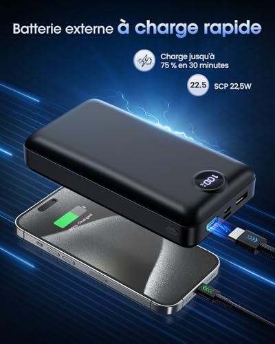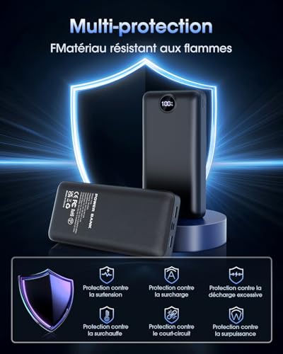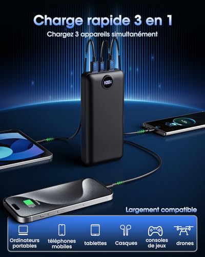 Batterie externe de 50000mAh, équipée de 3 ports USB de sortie et de 2 ports d’entrée. Votre téléphone peut être chargé jusqu’à 10 fois, adaptée à la plupart des appareils électroniques et à divers scénarios. La fonction de charge rapide de cette batterie externe de 50000mAh réduit considérablement le temps de charge de l’appareil. Avec un port USB-C de 22,5W, elle permet de charger l’iPhone 15 de 20 % à 60 % en seulement 30 minutes. La batterie externe de 50000mAh est équipée d’un écran numérique qui affiche en temps réel l’état de la batterie. Elle présente une texture mate délicate, qui est non seulement résistante aux rayures, mais offre également une sensation agréable au toucher. Adaptée à la plupart des appareils, cette batterie externe portable peut charger l’iPhone 14 jusqu’à 10 fois, ainsi que les appareils Samsung 10 fois. Elle est idéale pour le camping, la randonnée, les vacances, les voyages et bien plus encore. Cette batterie externe portable de 50000mAh est équipée d’un circuit intégré intelligent pour prévenir la surcharge, la surtension, les surintensités et les courts-circuits, assurant ainsi une utilisation en toute sécurité.
