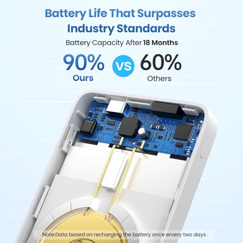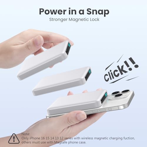 【Batterie Externe Magnétique pour iPhone】 Cette batterie externe magnétique adopte la dernière technologie magnétique (adsorption magnétique et nano plus forte), se fixe directement à l’arrière de votre iPhone, assure un alignement parfait et une charge efficace. Il est conçu pour les séries iPhone 16, 15, 14, 13 et 12. (Remarque : Doit être aligné avec une aspiration magnétique, sans étuis ou avec des boîtiers magnétiques ; Non compatible avec d’autres séries d’iPhone). 【Taille mini et conception légère】 La magnétique batterie externe ne mesurant que 10,3 * 6,8 cm, 2,1 cm d’épaisseur, poids 202 g. Il n’obscurcit pas l’objectif de votre téléphone, et sa taille et son poids confortables vous permettent de le transporter facilement dans votre main ou votre poche, même lorsque vous chargez votre téléphone. Il est également possible de prendre des appels et des selfies d’une seule main pendant la charge, ce qui est idéal pour transporter une batterie de secours. 【20W PD USB C Entrée et sortie】 Notre chargeur portable sans fil est équipé d’un port d’entrée et de sortie USB C 20 W, qui peut non seulement recharger rapidement la batterie externe (adaptateur non inclus), mais également répondre à vos besoins de charge filaire et sans fil pour votre appareil. 【Charge sans fil rapide】 En se débarrassant des chaînes des câbles de charge traditionnels, notre batterie externe sans fil magnétique vous permet de charger facilement à tout moment, n’importe où, sans vous soucier de la perte ou de l’endommagement du câble de charge. Idéal pour les sorties et les voyages. Et la batterie externe magnétique est en silicone pour éviter de rayer votre téléphone. 【Affichage LED et multi-protection】Batterie externe équipée d’un affichage LED, la puissance restante peut être affichée avec précision à 1%. À l’aide de puces intelligentes de haute qualité et de systèmes de sécurité intelligents intégrés, ajustez automatiquement la sortie pour fournir le courant le plus approprié, protégez votre appareil contre les accidents tels que les surcharges, les décharges excessives,élevées tout en prolongeant la durée de vie de la batterie. 【Ce que vous obtenez】 Batterie Externe Magnétique sans Fil 10800mAh x 1, câble de charge USB-C x 1, sac de protection x 1, manuel d’utilisation x 1, garantie sans souci de 24 mois et service client amical. Tout problème s’il vous plaît n’hésitez pas à nous contacter.