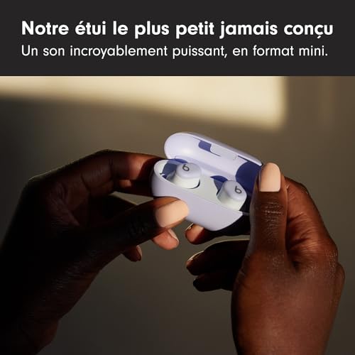 Jusqu’à 18 heures d’autonomie. Avec la technologie Fast Fuel, 5 minutes de charge offrent 1 heure d’écoute. Adapteur secteur et câble de charge USB-C vendus séparément. L’architecture acoustique personnalisée offre un son Beats puissant avec une palette sonore ample et une clarté naturelle. Ces puissants écouteurs s’accompagnent du plus petit étui de notre gamme et peuvent donc vous accompagner partout. Les transducteurs à deux couches réduisent les distorsions tout en assurant la haute fidélité du son. Les transducteurs à alignement axial savamment positionnés délivrent le son directement dans vos oreilles. Les évents découpés au laser améliorent les performances audio tout en réduisant la pression pour un confort optimal. Chargez directement depuis votre téléphone, votre tablette ou votre ordinateur pour davantage d’autonomie même en déplacement. La compatibilité avec les appareils iOS et Android permet de profiter du jumelage d’un seul geste. Chaque écouteur est équipé d’un microphone de pointe optimisé par un algorithme avancé de reconnaissance des bruits pour une qualité d’appel exceptionnelle. Le Bluetooth classe 1, le meilleur du marché, vous offre une portée sans fil plus élevée avec moins de pertes de connexion.