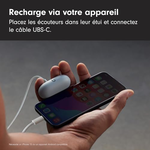 Jusqu’à 18 heures d’autonomie. Avec la technologie Fast Fuel, 5 minutes de charge offrent 1 heure d’écoute. Adapteur secteur et câble de charge USB-C vendus séparément. L’architecture acoustique personnalisée offre un son Beats puissant avec une palette sonore ample et une clarté naturelle. Ces puissants écouteurs s’accompagnent du plus petit étui de notre gamme et peuvent donc vous accompagner partout. Les transducteurs à deux couches réduisent les distorsions tout en assurant la haute fidélité du son. Les transducteurs à alignement axial savamment positionnés délivrent le son directement dans vos oreilles. Les évents découpés au laser améliorent les performances audio tout en réduisant la pression pour un confort optimal. Chargez directement depuis votre téléphone, votre tablette ou votre ordinateur pour davantage d’autonomie même en déplacement. La compatibilité avec les appareils iOS et Android permet de profiter du jumelage d’un seul geste. Chaque écouteur est équipé d’un microphone de pointe optimisé par un algorithme avancé de reconnaissance des bruits pour une qualité d’appel exceptionnelle. Le Bluetooth classe 1, le meilleur du marché, vous offre une portée sans fil plus élevée avec moins de pertes de connexion.