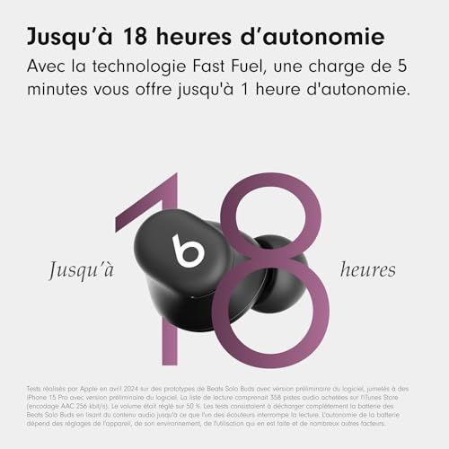 Jusqu’à 18 heures d’autonomie. Avec la technologie Fast Fuel, 5 minutes de charge offrent 1 heure d’écoute. Adapteur secteur et câble de charge USB-C vendus séparément. L’architecture acoustique personnalisée offre un son Beats puissant avec une palette sonore ample et une clarté naturelle. Ces puissants écouteurs s’accompagnent du plus petit…