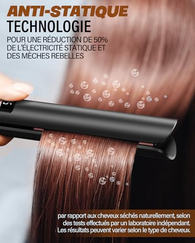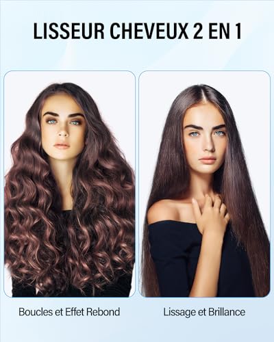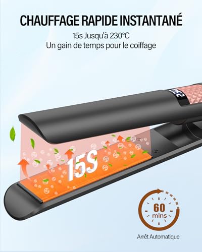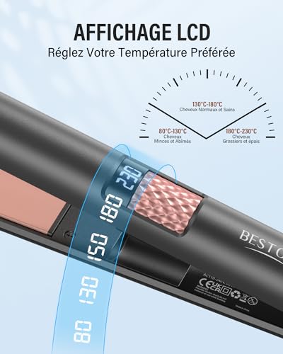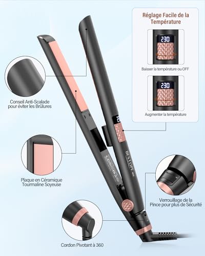 Plaques en Céramique Ultra Lisses : La plaque flottante 3D du BESTOPE MIX fer a lisser peut être inclinée à différents angles pour s’adapter à la coiffure souhaitée. Les plaques en céramique tourmaline du fer à lisser sont imprégnées d’un revêtement antistatique et de kératine, ce qui assure une distribution uniforme de la chaleur sans points chauds, minimise les frisottis et les mèches rebelles, et vous donne des cheveux lisses et brillants qui durent toute la journée Affichage LCD et Réglage Facile de la Température : Notre lisseur est doté d’une plage de 15 températures allant de 80°C à 230°C. Le réglage innovant de la température par rotation et l’écran LCD transparent vous permettent de personnaliser la chaleur en fonction de votre type de cheveux et de vos besoins en matière de coiffure. Notre lisseur cheveux est idéal pour tous les types de cheveux, qu’ils soient fins ou épais, bouclés ou lisses. 80°C-130°C pour les cheveux fins et abîmés. 130°C-180°C pour les cheveux normaux et sains et 180°C-230°C pour les cheveux grossiers et épais Chauffage Instantané en 15 Secondes : Avec nos fer à lisser 2 en 1, plus besoin d’attendre que votre plaque cheveux chauffe en seulement 15 secondes, soit 3 fois plus vite que les autres hair straightener standard – vous êtes prêt à partir en un rien de temps. La glisse douce en un seul passage vous permet de lisser ou de boucler vos cheveux sans effort Une Compagnie de Voyage Optimale : Notre câble de 2,5 m de long à 360° garantit la flexibilité et empêche l’enchevêtrement pendant le coiffage. Le fer a lisser est doté d’un double voltage 110V-240V, ce qui le rend idéal pour les voyages. Nous fournissons également un gants résistant à la chaleur, 2 pinces et une pochette de rangement de luxe pour une meilleure expérience Conception Résistante à la Chaleur : Notre lisseur cheveux 2 en 1 est équipé d’une poignée antidérapante et résistante à la chaleur, qui vous assure une prise en main confortable lorsque vous coiffez vos cheveux lisses ou bouclés. L’embout et le support anti-brûlure garantissent également votre sécurité. Finies les brûlures accidentelles et créez en toute confiance des coiffures impeccables grâce à notre lisseur cheveux professionnel