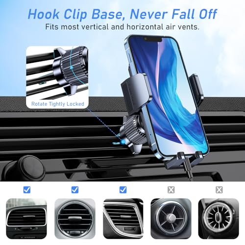 Crochet à clip robuste : adopte le dernier design de clip à crochet, les crochets sont en métal spécial, ce qui les rend plus résistants et durables. Et la longueur du clip de crochet peut être ajustée en tournant le bouton de réglage, qui peut être fixé plus fermement sur la lame de ventilation que le crochet traditionnel. Opération à une main : dispose d’un système de libération à un bouton qui vous permet de libérer votre téléphone d’une seule main. Appuyez simplement sur les bras de serrage des deux côtés pour verrouiller l’appareil. Pas d’opérations compliquées, vous offrant une expérience de conduite plus sûre et meilleure. Protection intégrale : le design triangulaire super stable protège parfaitement votre appareil mobile des secousses et des glissements pendant la conduite. De plus, le bras du clip et le support sont équipés de coussinets en silicone super doux et super élastiques pour garantir que l’appareil et la sortie d’air de la voiture ne soient pas rayés pendant la conduite. Rotation flexible à 360° : ce support de téléphone pour voiture est équipé d’une rotule rotative à 360°, qui vous aide à faire pivoter le support de voiture horizontalement et verticalement. Il ne bloque pas la vue et peut être facilement ajusté d’une main pour vous offrir le meilleur angle de vision sans interférer avec la vision pendant la conduite. Vous pouvez naviguer, répondre aux appels et écouter de la musique dans votre voiture. Large compatibilité : le support convient à la plupart des grilles d’aération de voiture, y compris les grilles d’échappement horizontales et verticales. Il est également compatible avec tous les appareils de 4 à 7 pouces, y compris adapté pour iPhone 16/16Plus/16Pro/16Pro Max/15/15 Plus/15 Pro/15 Pro Max/14/13/12 Pro/XR /7/8 Plus/9, etc.