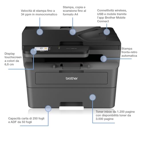 Vitesse d’impression allant jusqu’à 34 pages par minute Impression en recto verso, jusqu’à 16 faces par minute Numérisation jusqu’à 22,5 faces par minute Panneau de contrôle couleur tactile de 6,8cm Ethernet, WiFi 5GHz et USB Mémoire de 256 Mo Chargeur automatique de document de 50 feuilles Bac d’entrée papier de 250 feuilles Livré avec un toner de 1 200 pages Toner disponible en 3 000 pages