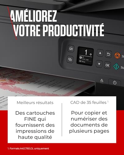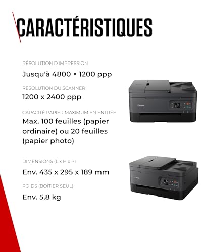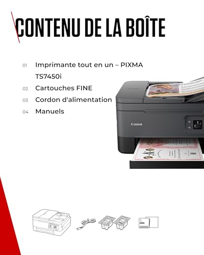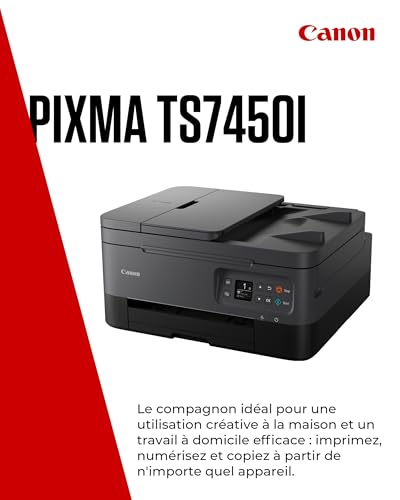 NE SOYEZ PLUS JAMAIS À COURT D’ENCRE : souscrivez à PIXMA Print Plan et profitez de la livraison automatique de cartouches d’encre à domicile, juste au moment où vous en avez besoin. Cet abonnement flexible se base sur le nombre de pages imprimées pour détecter quand le niveau d’encre est bas et il programme une livraison de cartouche avant que vous ne soyez à court d’encre. ALIMENTEZ VOS FONCTIONNALITÉS : laissez l’imprimante couleur wifi PIXMA TS7450I simplifier votre travail grâce à son chargeur automatique de documents, vous permettant de copier et de numériser facilement plusieurs pages sans avoir besoin de les retirer ou de les recharger. VOTRE STATION D’INSPIRATION : laissez libre cours à votre imagination avec cette imprimante multifonction wifi débordante de créativité : elle est parfaite pour les activités artistiques avec les plus petits et pour vos propres projets créatifs. Imprimez sur différents supports, comme du papier photo ou du papier magnétique. INTELLIGENTE MAIS SIMPLE : profitez d’une connectivité sans égale avec cette imprimante rechargeable. Imprimez sans effort depuis votre ordinateur, votre smartphone ou même votre appareil photo, grâce à la technologie Wi-Fi intégrée. DES APPLICATIONS QUI VOUS DONNENT LE SOURIRE : utilisez une suite d’applications pratiques sur cette imprimante avec réservoir d’encre pour imprimer facilement à partir de vos smartphones et vos tablettes. Explorez les services cloud, trouvez l’inspiration artistique, et plus encore, directement à partir de nos applications.