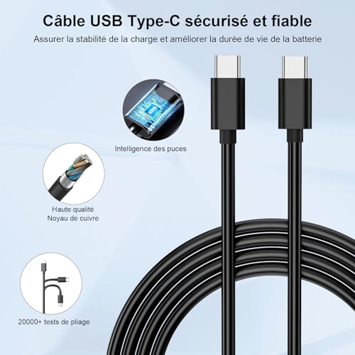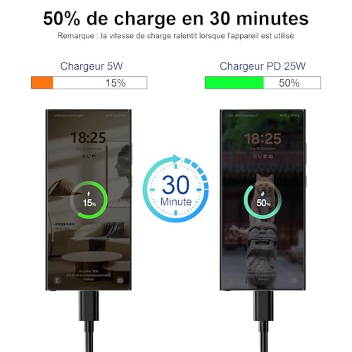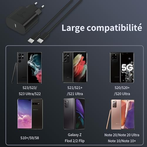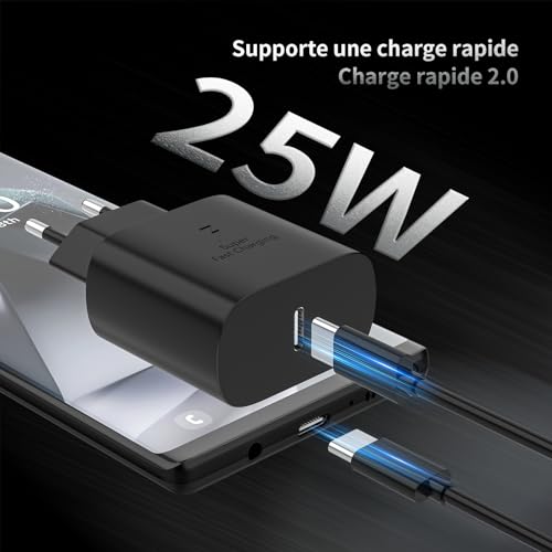 Largement Compatibles: Compatible avec Samsung Galaxy A15 A16 A23 A32 A33 A34 A35 A52 A52s A53 A54 A55 S24 S23 S22 S21 S20 S20 + S20 FE S20 Ultra 5G S21 S21 Ultra S22 Z Fold2 5G Fold 5G Z Flip Z Flip 5G Z Flip 3. Galaxy Z Flip 5G Galaxy Fold Galaxy Z Flip 5G Galaxy Z Fold2 Galaxy Z Fold2 5G Galaxy z Flip Note 8 Note 9 Note 10 Note 20 Ultra Note 20 5G etc Chargeur rapide 25W Samsung USB C:Conçu pour la série Samsung Galaxy,ce chargeur USB C 25W peut charger rapidement le Samsung s23 Ultra de 0à60%en 30 minutes avec une grande efficacité.Avec une puissance maximale de 25 W,il est 5 fois plus rapide que les chargeurs muraux USB C standard Chargement sûr : équipé d’une puce IC intelligente et d’une puce de protection pour éviter les courts-circuits, les surtensions, les surchauffes et les surintensités et protéger l’appareil en toute sécurité. Le matériau ABS ignifuge de haute qualité présente une résistance élevée à la température pour une dissipation optimale de la chaleur. Il arrête également la charge lorsque la batterie de l’appareil est pleine, ce qui garantit une charge plus sûre de votre téléphone portable pendant la nuit Câble USB C to C 2M: En plus de chargeur type C secteur prendre en charge Quick Charge,le câble USB C vers USB C 2m fourni avec le USB C chargeur rapide pour Samsung prend en charge une charge sécurisée à haute vitesse 3A et des vitesses de transfert de données jusqu’à 480 Mbps. Vous pouvez également charger votre téléphone et tout appareil de type C à partir de plus grandes distances Tu auras: Un chargeur secteur USB C 25W et 2m câble USB C to C et un manuel d’instructions. Nous offrons une garantie de 24 mois pour chargeur USB C rapide , si vous avez des questions sur Samsung chargeur USB C, n’hésitez pas à nous contacter