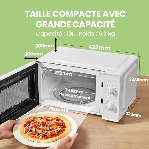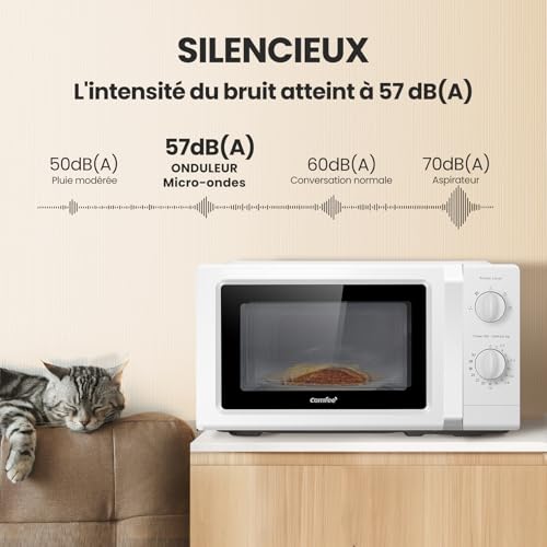 Design compact : Le micro-ondes COMFEE’ CMO-MP012OC(WH) offre une capacité de 19L et une puissance de 700W avec 5 niveaux de puissance réglables. Son format compact permet de placer une assiette de 273 mm ou une pizza de 10 pouces sur son plateau tournant de 245 mm. Décongélation uniforme : ce micro-ondes peut maintenir une température uniforme dans différentes portions d’aliments, garantissant ainsi un résultat de décongélation uniforme. Économie d’Énergie Remarquable: Avec la technologie REVOLUTION WAVE, l’efficacité de conversion d’énergie s’accroît de 20,5 % par rapport aux micro-ondes traditionnels. Faible Bruit: Le four à micro-ondes Comfee CMO-MP012OC(BK) a réussi à réduire le niveau sonore à 57 dB(A), ce qui est inférieur à celui d’une conversation normale. Léger et stable : équipé de tapis antidérapants sur le fond, le micro-ondes est aussi stable qu’un roc malgré son poids léger.