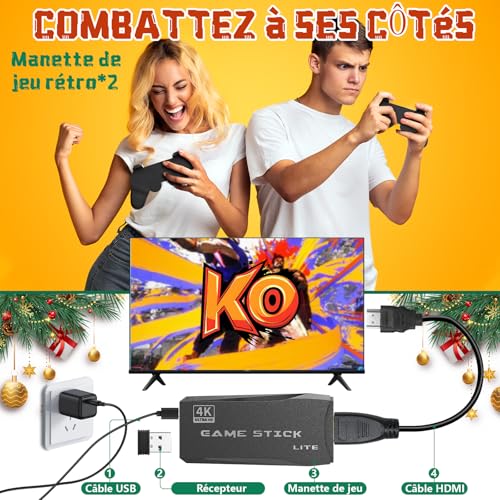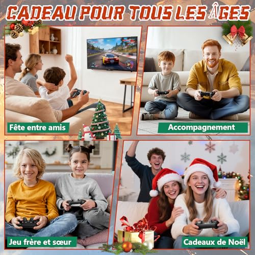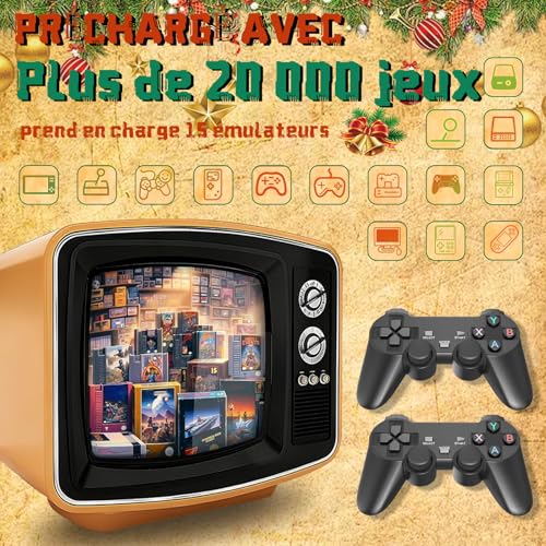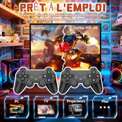 Plus de 20 000 jeux rétro intemporels et 15 émulateurs : cette console de jeux rétro est préchargée avec plus de 20 000 jeux classiques des années 80/90, ainsi que des émulateurs intégrés, sans téléchargement ni connexion Internet. Parfaite pour revivre la nostalgie de l’enfance ou découvrir les jeux rétro. Des images immersives en 4K HD : la console de jeux rétro dispose d’une sortie HDMI 4K pour un gameplay net et dynamique sur les téléviseurs, les moniteurs et les ordinateurs portables. Améliorez votre expérience de jeu avec une nostalgie haute définition qui semble nouvelle et passionnante. Une véritable commodité Plug & Play : en tant que manette de jeu conviviale, il suffit de la connecter à une prise HDMI et à une alimentation USB, sans configuration compliquée. La console de jeux rétro vous permet de jouer en quelques secondes, ce qui est idéal pour les joueurs occasionnels et les familles. Deux manettes 2,4 GHz : comprend deux manettes de jeu 2,4 GHz réactives avec des connexions stables et à faible latence (jusqu’à 15 m). Profitez du plaisir du multijoueur avec la manette de jeu rétro lors de réunions de famille, de soirées entre amis ou de duels en tête-à-tête. Jeux vidéo Plug & Play de 64 Go : la mémoire intégrée de 64 Go peut stocker des milliers de jeux, et la fonction de sauvegarde vous permet de reprendre là où vous vous êtes arrêté. Une console de jeux vidéo polyvalente qui constitue un cadeau attentionné pour les joueurs de tous âges. Si vous rencontrez des problèmes, n’hésitez pas à nous contacter immédiatement pour obtenir de l’aide, notre équipe après-vente est à votre disposition 24 heures sur 24, 7 jours sur 7.