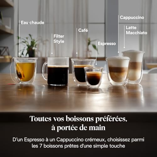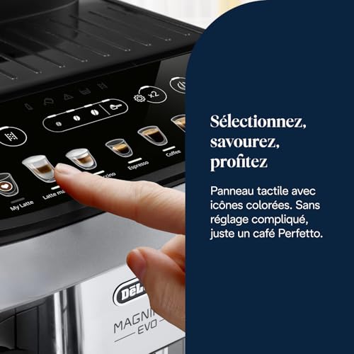 DÉCOUVREZ MAGNIFICA EVO: pour les amateurs de cappuccino et de design moderne, avec 7 boissons à préparer d’une simple touche, pour tous les goûts, pour les matins chargés ou les week-ends calmes, le café de qualité barista dans votre cuisine VOTRE CAFÉ, D’UNE SIMPLE TOUCHE: profitez de 7 boissons en accès direct, de l’Espresso au Cappuccino, grâce à la LatteCrema Hot Technology chaque tasse est couronnée d’une mousse de lait riche et crémeuse, un rêve pour les amateurs de Cappuccino DÉGUSTEZ UN CAPPUCCINO DE QUALITÉ BARISTA À LA MAISON: avec la technologie LatteCrema Hot, obtenez une mousse crémeuse à chaque tasse et ajustez le ratio lait-espresso avec MyLatte pour un résultat sur mesure CAFÉ FRAÎCHEMENT MOULU, À CHAQUE TASSE: chaque tasse est préparée avec des grains fraîchement moulus grâce au moulin intégré; 13 réglages pour un arôme et une fraîcheur maximal PROPRE ET PRÊTE POUR LA PROCHAINE TASSE: nettoyage automatique de la carafe à lait en un geste et plateau avec grille compatible lave-vaisselle pour moins d’entretien CE N’EST PAS JUSTE PARFAIT. C’EST PERFETTO. Du café du matin au cappuccino du du goûter, Magnifica Evo transforme chaque gorgée en un moment de pur plaisir.