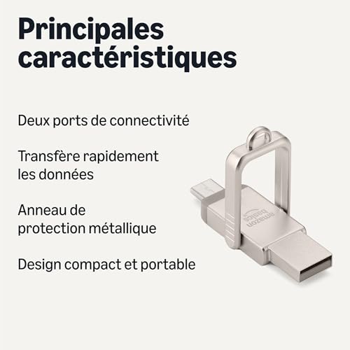STOCKAGE : capacité de stockage nominale de 256Go. La capacité indiquée par l’appareil peut être inférieure à celle figurant sur l’étiquette du produit en raison de normes de mesure différentes. Capacité de stockage disponible : > 230Go DOUBLE PORT : clé USB pour faciliter le transfert de données entre téléphones, tablettes et ordinateurs PERFORMANCES ET EFFICACITɠ: clé USB portable formatée en exFAT, offrant une faible consommation d’énergie, des performances fiables et une compatibilité étendue avec les appareils AVERTISSEMENT : les vitesses de lecture et d’écriture ont été mesurées lors de tests internes réalisés dans des conditions contrôlées. Les vitesses réelles peuvent varier selon l’appareil utilisé, la taille et le type des fichiers transférés, etc. DESIGN HAUT DE GAMME : boîtier extérieur en métal avec système rotatif d’ouverture et de fermeture ; trou d’accrochage pour un rangement pratique