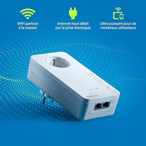 Adaptateur CPL ultra-performant pour étendre votre réseau WiFi Mesh dans l’ensemble du domicile, idéal pour le télétravail. Fonctionne obligatoirement avec un second adaptateur Magic ou plus Technologie CPL innovante (G.hn) par le leader du marché : vitesse de transmission maximale de 2400 Mbits/s pour une connexion haut débit de tous vos appareils Liberté numérique : le WiFi Mesh haut débit avec l’Access-Point-Steering assure une connexion optimale de vos terminaux Plaisir multimédia partout : grâce à la technologie multi-utilisateurs MIMO, mettez le meilleur WiFi possible à disposition de plusieurs terminaux en même temps Solution réseau complète : 1 prise CPL complémentaire pour tous les produits Magic, 2 ports Ethernet Gigabit, point d’accès WiFi. Compatibles avec tous les adaptateurs Magic et toutes les box internet Consommation de courant en veille: 3.1 W Systèmes d’exploitation pris en charge : à partir de Windows 7, à partir de Mac OS X 10.9, à partir d’Ubuntu-Linux 14.04 Le Magic 2 WiFi next convient parfaitement aux appareils suivants: Données du cloud, Scanner, Ordinateur, Console de jeu, Smartphone, Tablet, Smart TV, Ordinateur portable