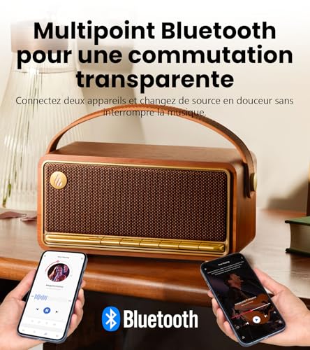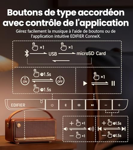 Audio haute résolution supérieure de 40 W RMS : Le MP330 est équipé d’un ADC et d’un amplificateur haute performance, prenant en charge le traitement audio haute résolution 24bit/96kHz. Le haut-parleur ovale de médium-grave avec aimants en néodyme (53 mm x 93 mm, vers l’avant), le tweeter de 22 mm avec aimants en néodyme (vers l’avant et vers l’arrière) et le radiateur passif ovale pour les basses vous offrent un son de qualité et des basses percutantes et agréables. Classique et vintage : Le clavier accordéon, facile à contrôler, est situé sur le panneau avant. La palette légendaire et le design des mailles, inspirés des radios vintage, en font un produit stylé, élégant et intemporel. Longue durée de vie de la batterie : La batterie intégrée permet jusqu’à 19 heures de lecture (à 50 % du volume) après une charge complète. Bluetooth 6.0 et connexion multipoint : Prenant en charge la connexion simultanée de deux appareils Bluetooth, le MP330 permet de coupler deux appareils comme un système de haut-parleurs stéréo pour répondre à vos besoins les plus exigeants. Le récepteur audio Bluetooth V6.0 garantit un flux audio transparent avec une connexion stable. Non seulement il prend en charge le Bluetooth, mais il comprend également des entrées USB-C et carte TF. Applications multiples : La poignée de conception moderne est facile à déplacer à l’extérieur pour le pique-nique, le camping, le sport ou les barbecues. Il s’agit également d’une décoration élégante à placer à la maison lorsque vous vous détendez, que vous vous réunissez ou que vous faites la fête. L’application EDIFIER ConneX : Personnalisez votre expérience d’écoute avec l’application EDIFIER ConneX, y compris les paramètres d’égalisation personnalisés, gérez les connexions sans effort et plus encore.