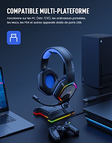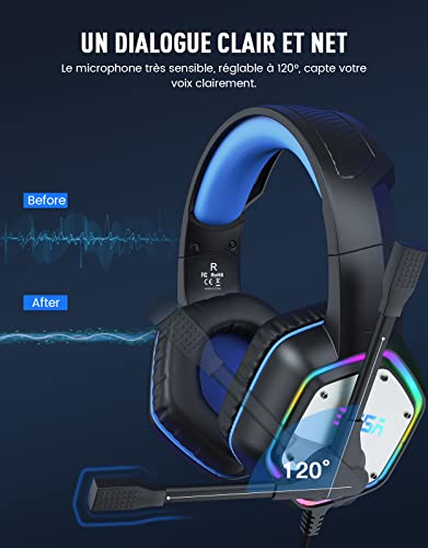 [Son Surround 7.1 – Plug and Play] Le casque gaming PC avec effets son surround 7.1 vous permet d’obtenir un positionnement son précis dans le jeu. Pas besoin d’installer de pilotes, il suffit de brancher USB pour profiter d’un son surround 7.1 pour une expérience de jeu immersive. [Pilote 50MM et lumières RVB froides] Les casque pilotes en néodyme de 50 mm de haute précision vous offrent une expérience de jeu immersive avec un son incroyablement réaliste, où vous pouvez clairement ressentir chaque note pour une expérience de jeu exceptionnelle. Les casque lumières RVB cool créent une atmosphère super cool et ludique pour vous, vous offrant une expérience de jeu plus immersive. [Conception Ergonomique Confortable] Les casque gamer cache-oreilles en protéines à mémoire douce de qualité supérieure garantissent un confort ultime, même pendant une période prolongée. De plus, il y a un confort absolu pendant les longues sessions de jeu avec un bandeau réglable conçu pour une répartition équilibrée du poids et une force de serrage réduite. Les câbles extrêmement résistant de 2,2 m vous permet de profiter de votre jeu sans limite. [Effet Vocal Clair] Le casque audio pour PS4/PS5 réduit les bruits de fond gênants et garantit une communication forte et cristalline grâce à son microphone haute sensibilité réglable à 120°. La technologie de réduction du bruit omnidirectionnelle du casque gamer vous permet de profiter d’un son de qualité lorsque vous jouez ou discutez dans le jeu. [Compatibilité Multiplateforme] Ce casque avec micro professionnel est compatible avec PC (Windows 7/8/10), les consoles PS4 / PS5, les ordinateurs portables et autres appareils avec des ports audio USB. Nous offrons un support client 24h/24 et une garantie de 2 ans. Nous ferons de notre mieux pour être responsables de votre expérience d’achat.