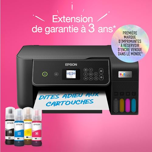 EcoTank offre une impression à domicile simple : les réservoirs d’encre ultra haute capacité sont facilement rechargeables et les bouteilles sont dotées d’un détrompeur pour ne plus se tromper de couleur en remplissant le réservoir. Cette imprimante multifonction vous permet d’économiser jusqu’à 90 % sur vos coûts d’impression* et elle est livrée avec jusqu’à 3 ans d’encre*. Un jeu de bouteilles d’encre permet d’imprimer jusqu’à 4 500 pages en monochrome et 7 500 pages en couleur*, soit l’équivalent de jusqu’à 72 cartouches d’encre !* Cette application vous permet de contrôler votre imprimante à partir de votre appareil mobile*. Vous pouvez imprimer, copier et numériser des documents et des photos, mais aussi configurer, surveiller et dépanner votre imprimante, et laissez libre cours à votre créativité grâce à une large gamme de modèles artistiques. Grâce à un écran couleur LCD de 3,7 cm, à un bac papier arrière de 100 feuilles, à l’impression photo sans marge (jusqu’à 10 × 15 cm) ainsi qu’à des vitesses d’impression pouvant atteindre 10 pages par minute*, vous pouvez effectuer rapidement plusieurs tâches en toute simplicité. * Voir epson.fr/ecotankfootnotes