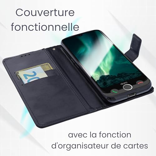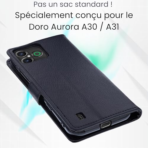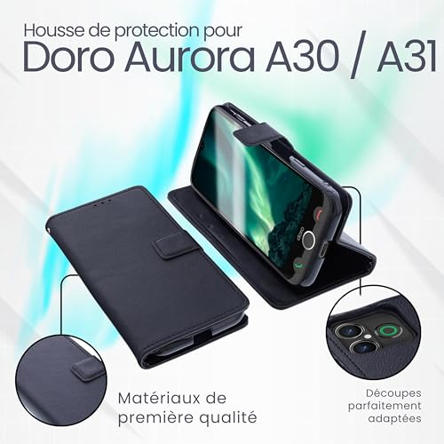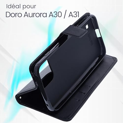 COQUE DE PROTECTION AJUSTÉE COMPATIBLE AVEC Doro Aurora A30 / A31 – L’intérieur avec une coque en TPU parfaitement ajustée assure un maintien sécurisé du smartphone. TOUTES LES DÉCOUPES NÉCESSAIRES SONT PRÉSENTES – L’appareil photo et le port de charge sont précisément découpés, ainsi que le haut-parleur, le microphone et d’autres ouvertures essentielles. Les boutons latéraux sont marqués pour une utilisation optimale. PAS UNE COQUE UNIVERSELLE ADHÉSIVE – Notre étui à rabat en noir est spécialement conçu pour votre Doro Aurora A30 / A31. Pas besoin de coller le téléphone ni de le faire glisser vers le haut pour prendre des photos. AVEC FONCTION SUPPORT POUR VIDÉOS ET PHOTOS – Positionnez votre téléphone à l’angle souhaité pour un affichage confortable de l’écran. COMPARTIMENTS POUR VOS CARTES – Cette coque en cuir synthétique vous permet d’avoir toujours à portée de main vos cartes les plus importantes, comme la carte bancaire, la carte de crédit, la carte d’identité, le permis de conduire et l’abonnement aux transports.