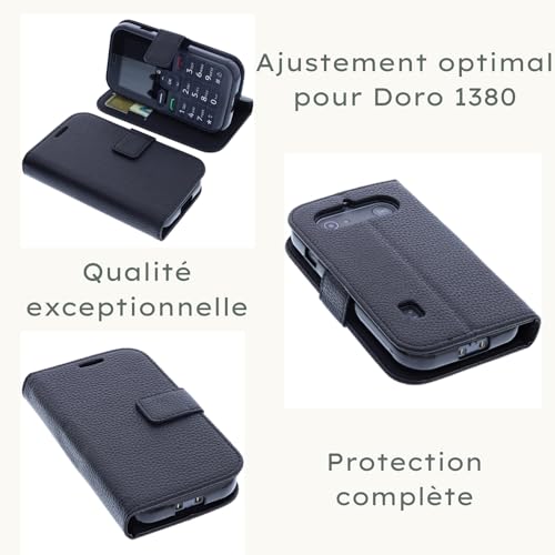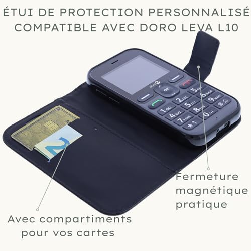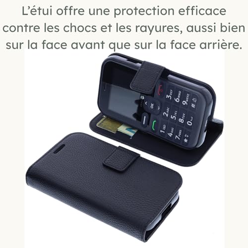 COQUE DE PROTECTION AJUSTÉE COMPATIBLE AVEC Doro Leva L10 – L’intérieur avec une coque en TPU parfaitement ajustée assure un maintien sécurisé du smartphone. TOUTES LES DÉCOUPES NÉCESSAIRES SONT PRÉSENTES – L’appareil photo et le port de charge sont précisément découpés, ainsi que le haut-parleur, le microphone et d’autres ouvertures essentielles. Les boutons latéraux sont marqués pour une utilisation optimale. PAS UNE COQUE UNIVERSELLE ADHÉSIVE – Notre étui à rabat en noir est spécialement conçu pour votre Doro Leva L10. Pas besoin de coller le téléphone ni de le faire glisser vers le haut pour prendre des photos. AVEC FONCTION SUPPORT POUR VIDÉOS ET PHOTOS – Positionnez votre téléphone à l’angle souhaité pour un affichage confortable de l’écran. COMPARTIMENTS POUR VOS CARTES – Cette coque en cuir synthétique vous permet d’avoir toujours à portée de main vos cartes les plus importantes, comme la carte bancaire, la carte de crédit, la carte d’identité, le permis de conduire et l’abonnement aux transports.