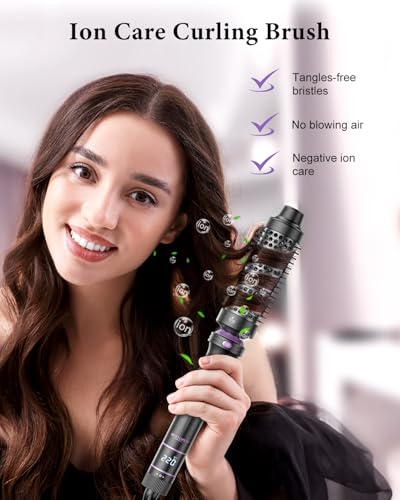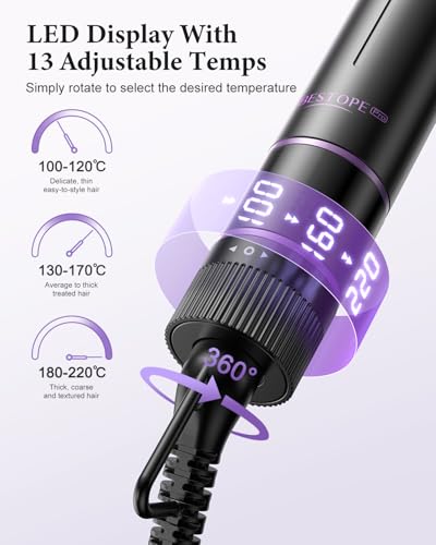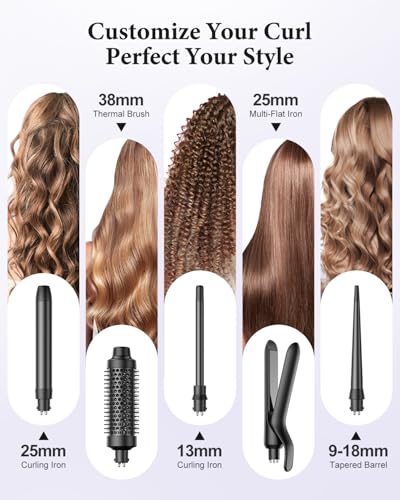 【Fer à Boucler 5 en 1 】Fer à boucler avec différents accessoires, dont une brosse thermique de 38 mm, un lisseur en céramique, un fer à boucler conique et 2 fers à boucler (13 mm/25 mm) – pour toutes les coiffures, des plus bouclées aux plus lisses. 【13 TEMPERATURES ET AFFICHAGE LED】 Ce fer est doté d’un affichage LED et de 13 températures réglables (100°C-220°C). Vous pouvez ainsi choisir rapidement la température idéale pour votre type de cheveux et réaliser des coiffures précises sans dégâts dus à la chaleur. 【CHAUFFAGE RAPIDE EN 30 SECONDES ET SOIN PAR IONISATION】Grâce à son revêtement en céramique et à sa double conception PTC, le fer ondulé chauffe rapidement et distribue la chaleur de manière homogène en 30 secondes. Il libère également des ions négatifs pour assouplir les boucles, réduire l’électricité statique et rendre les cheveux lisses et brillants. 【CONCEPTION PENSÉE】 le fer à friser est non seulement doté d’une tête anti-brûlure, mais aussi d’un gant isolé et de coussinets résistants à la chaleur pour éviter les brûlures et protéger la surface de travail. Le fer portable à double tension (120V-240V) est parfait pour voyager dans le monde entier, et le cordon pivotant de 2,5 m facilite le coiffage à la maison ou dans un salon de coiffure. 【PLUSIEURS OPTIONS DE COIFFURE 】 Que vous souhaitiez créer des boucles volumineuses et rebondissantes, des ondulations de plage, des ondulations douces et lâches ou des cheveux raides et lisses, l’outil de bouclage 5 en 1 est là pour vous aider. Ce fer à boucler est sans aucun doute le cadeau idéal pour votre petite amie, votre femme ou votre fille !