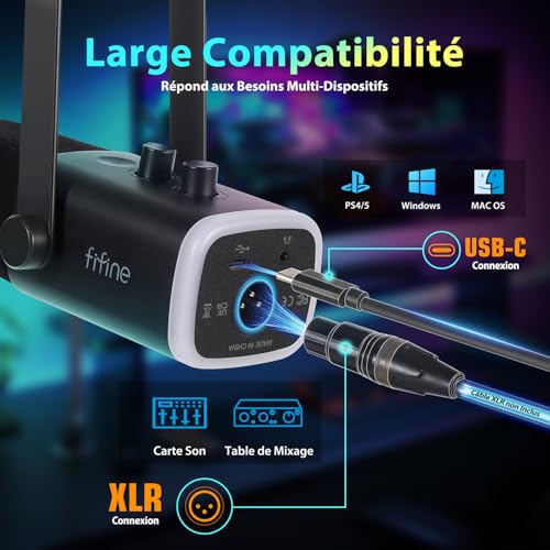| Caractéristiques spéciales | Connectivité USB/XLR, éclairage RVB, bras réglable, bouton muet, régulateur de gain, prise casque avec contrôle du volume, convient pour les jeux, le streaming, le podcasting et les voixs |