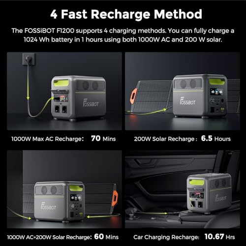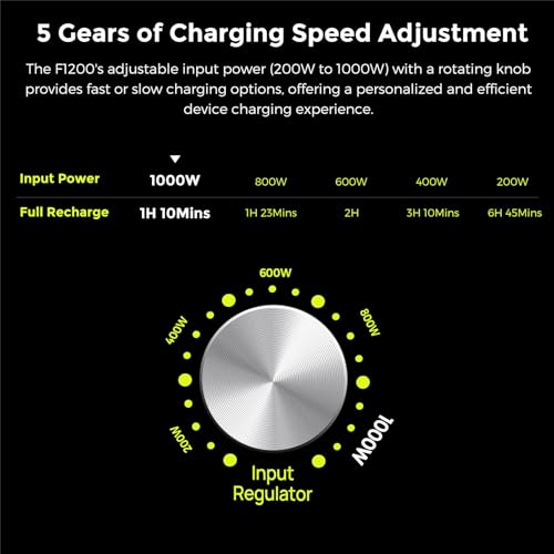 [0-80% de charge en 49 minutes] La charge flash de 1000W charge complètement la station de charge F1200 de 1024Wh en 70 minutes. Chargement rapide. [Source d’énergie à long terme] Comptez sur une longévité de 10 ans et 3 000+ cycles de batterie de la batterie LiFePO4 pour une utilisation durable à la maison ou en voyage. [7 ports pour tous] 1* Allume-cigares 12V/10A 2* USB-A 18W 2* USB-C (100W+20W) 2* Sortie AC 1200W, Le générateur solaire F1200 peut charger 95% de tous les appareils électriques. [5 niveaux de vitesse de charge] La puissance d’entrée du F1200 (200W à 1000W), réglable par un bouton rotatif, permet des charges rapides ou lentes et offre une expérience de charge personnalisée et efficace. [<10ms temps de commutation] Avec un temps de commutation inférieur à 10 ms, la F1200 power station garantit le fonctionnement ininterrompu des appareils critiques tels que les machines CPAP en cas de panne de courant. [Paket Enthält] Tragbare Power Station, AC-Ladekabel, Autoladekabel (MC4 an Zigarettenanzünder), Benutzerhandbuch, Solar-Ladekabel (MC4 an XT60) ,Zubehörtasche, 3 ans de garantie.