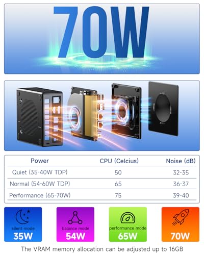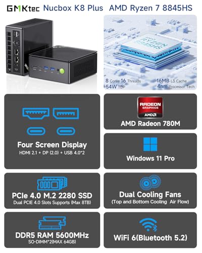 PC Gaming Avancé : Alimenté par le processeur AMD Ryzen 7 8845HS avec 8 cœurs / 16 threads, jusqu’à 5,1 GHz, et un cache L3 de 16 Mo. Ce puissant processeur excelle dans les jeux, le montage vidéo et le multitâche. Avec une plage de TDP de 35-54W, il assure une consommation d’énergie efficace sans compromettre la performance. 32 Go DDR5 + SSD PCIe 4.0 de 2 To : Équipé de 32 Go de RAM DDR5, avec des vitesses allant jusqu’à 5600 MHz, offrant un traitement des données plus rapide et un multitâche efficace. Les canaux doubles de 16 Go prennent en charge une extension jusqu’à 128 Go, permettant aux utilisateurs de personnaliser la capacité en fonction de leurs besoins. Le SSD M.2 PCIe 4.0 de 1 To assure un stockage ultra-rapide avec des options d’extension jusqu’à 8 To, idéal pour les charges de travail lourdes et les besoins de stockage important. Double carte réseau Intel i226V NIC 2,5 Gbps, WiFi 6 & BT 5.2 : Avec deux ports Ethernet Intel i226V 2,5 Gbps, le mini-PC K8 Plus offre des connexions réseau filaires plus rapides et plus stables, parfait pour les joueurs et les créateurs de contenu. Le WiFi 6 prend en charge plusieurs bandes de fréquence, garantissant une connexion sans fil rapide et à faible latence. Le BT 5.2 permet des transferts de données plus rapides, une consommation d’énergie réduite et la prise en charge des périphériques les plus récents. GPU Gaming AMD Radeon 780M : Le GPU intégré AMD Radeon 780M est basé sur la nouvelle architecture RDNA3 et dispose de 12 unités de calcul (CUs = 768 shaders) avec une fréquence allant jusqu’à 2700 MHz. Grâce à la nouvelle architecture et à des fréquences d’horloge plus élevées, la Radeon 780M devrait être nettement plus rapide que l’ancienne Radeon 680M. Cela signifie que les jeux les plus exigeants peuvent être joués avec des paramètres graphiques minimaux (comme Cyberpunk 2077), et les jeux moins exigeants comme FIFA 23 peuvent être joués avec des paramètres et résolutions plus élevés (1080p). Interface Oculink pour des connexions ultra-rapides : L’interface Oculink permet des connexions externes ultra-rapides pour l’expansion du stockage ou les mises à niveau de GPU. Elle offre des vitesses de transfert de données plus rapides que les interfaces traditionnelles, offrant une flexibilité accrue pour les utilisateurs nécessitant des performances supplémentaires pour des tâches comme des transferts de données volumineux ou l’utilisation d’un GPU externe. Sortie 4 écrans 4K avec connectivité avancée : Le mini-PC Nucbox K8 Plus prend en charge jusqu’à 4 écrans en résolution 4K/8K, via 2 ports USB4 (40 Gbps), HDMI 2.1 (8K@60Hz) et DisplayPort 2.1 (8K@60Hz). Les ports USB4 supportent Power Delivery 3.0 et DP1.4 pour un multitâche fluide, permettant aux utilisateurs d’exécuter plusieurs applications simultanément, parfait pour les stations de travail, les joueurs ou les créateurs de contenu professionnels. Trois modes de performance : Le mini-PC propose trois modes de performance personnalisables : Mode silencieux (35W), Mode équilibré (54W) et Mode performance (65W, avec un pic à 70W). Cette flexibilité permet d’optimiser les performances pour un fonctionnement silencieux ou des performances maximales en fonction de la charge de travail.