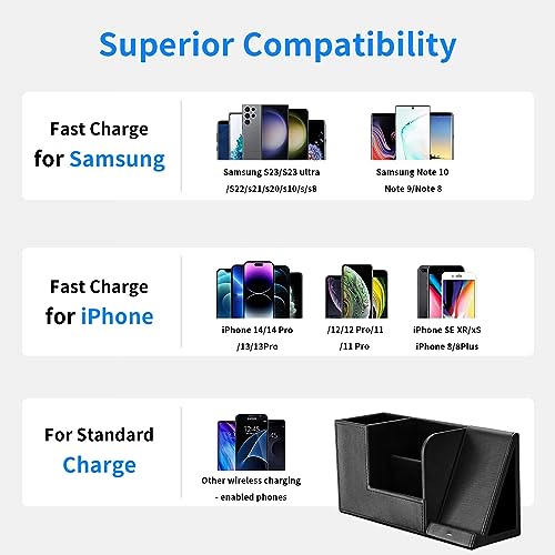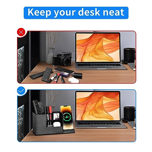 Chargeur sans fil dans un nouveau style : chargeur sans fil rapide 2 en 1 10 W avec porte-stylo. L’organisateur de bureau peut non seulement charger votre téléphone, mais également organiser vos articles soigneusement pour un accès facile, sans bureau ni câbles désordonnés. Cuir de haute qualité : cet organiseur de bureau sans fil est fabriqué en cuir synthétique de qualité supérieure et en bois, ce qui est très robuste et durable. Il peut être un cadeau pratique pour les femmes et les hommes pour un anniversaire, le Nouvel An, la Saint-Valentin, Noël. Porte-stylo multifonction : le porte-stylo GORESE peut être utilisé comme un organisateur de papeterie pour organiser téléphone portable, calculatrice, agrafeuse, stylo, ciseaux, télécommande et autres articles de papeterie. Sécurité et chargeur sans fil rapide : le chargeur sans fil rapide est équipé d’un adaptateur QC 3.0 de 18 W. Il prend en charge la charge rapide de 10 W pour iPhone, Samsung et tous les téléphones Android avec fonction de charge sans fil. L’organiseur de bureau en cuir a passé les certifications FCC, CE et RoHS. Large compatibilité : compatible avec iPhone 15/15 Pro/15 Pro Max/14/14 Pro/14 Pro Max/13/13 Pro/13 Pro Max/13 Mini/12/12 Pro/12 Pro Max/12 Mini/11/11 Pro/11 Pro Max/XS MAX/XS/XR/X/SE/SE2/8 Plus/8/Samsung Galaxy S23. S22, S21, S20, S9, etc. Contenu de la livraison : une station de charge GORESE porte-stylo pour le bureau, un adaptateur QC 3.0 de 18 W, un câble USB Type-C de 1,5 m, un manuel d’utilisation (français non garanti). Si vous rencontrez des problèmes avec ce porte-stylo pour bureau avec chargeur sans fil, veuillez nous contacter.