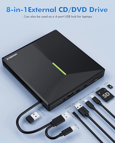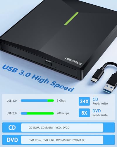 【USB 3.0 haute vitesse】doté de la technologie USB 3.0, ce lecteur DVD externe pour PC garantit des taux de transfert de données rapides allant jusqu’à 5 Gbit/s (625 Mo/s), environ 10 fois plus rapide que l’USB 2.0, et il est rétrocompatible avec l’USB 2.0/1.0. 【Compatibilité universelle】le lecteur CD externe prend en charge la lecture et l’écriture de disques de différents formats, par ex. CD±R/RW, CD-ROM, DVD±R/RW, DVD±R DL, DVD-ROM, DVD-RAM, VCD et SVCD. Il prend également en charge différents appareils, compatibles avec Windows 11/10/8/7/XP, Vista 7/8, Linux, Mac OS 10.6 ou supérieur tels que Apple MacBook Air et MacBook Pro. 【Plug & Play】 Pas besoin de pilotes ni d’alimentation externe. Branchez simplement le câble de données USB A/USB C et vous êtes prêt à partir. Le lecteur DVD externe est instantanément détecté par l’ordinateur. Notez que Mac OS n’affichera l’icône du périphérique qu’une fois le disque placé et lu ; Vous devez éjecter le disque via la commande Mac OS sans appuyer sur la touche d’éjection. 【Multifonction】 Le dernier ORIGBELIE lecteur CD DVD externe pour PC conçu avec une forte correction d’erreur, des capacités antidérapantes et silencieuses. Il offre des vitesses de lecture/écriture allant jusqu’à 8x pour les DVD et 24x pour les CD, peut facilement écouter de la musique, regarder des films, sauvegarder des données, installer des systèmes ou des jeux. Cependant, il n’est pas compatible avec les voitures, téléviseurs, tablettes, téléphones, projecteurs, Chrombook, Surface et Blu-ray. 【Compact et portable】avec son design fin et élégant, le graveur CD est un appareil facile à utiliser et portable, ce qui le rend idéal pour une utilisation en déplacement. Il dispose également des dernières lumières LED RVB qui peuvent faire un cycle et changer progressivement de couleur, transformant ce lecteur DVD USB ordinaire en un appareil cool et à la mode.