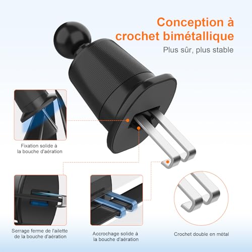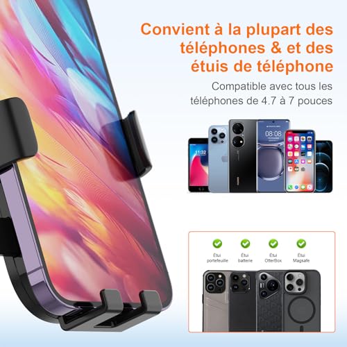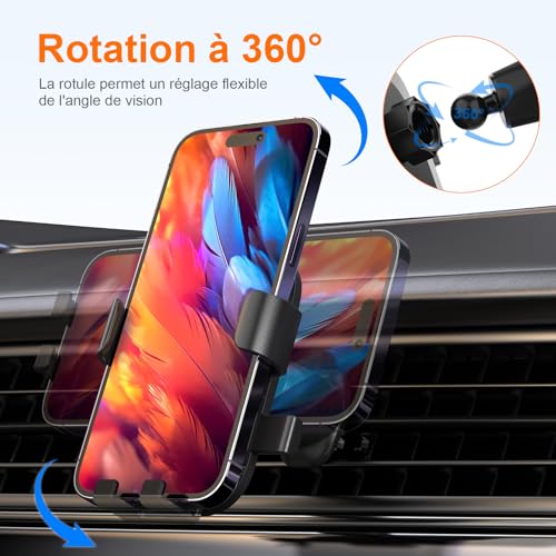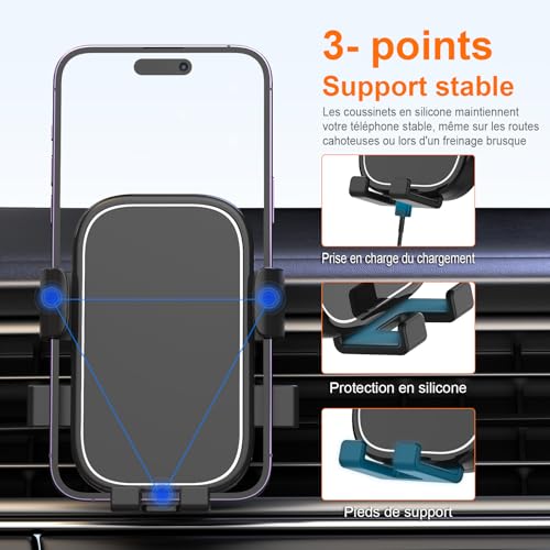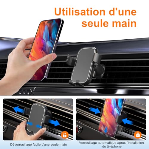 Mécanisme de verrouillage et de libération facile : Appuyez sur la petite barre horizontale en bas jusqu’à ce qu’elle se verrouille – les bras supérieurs s’ouvrent et restent en place. Placez votre téléphone dans le support et appuyez dessus pour qu’il pousse le crochet de support inférieur ; cela déclenchera la fermeture automatique des bras afin de maintenir votre téléphone fermement. Maintien stable et protection : Les coussinets en silicone antidérapants sur les bras et la base assurent une prise ferme sans rayures, même sur routes accidentées ou en cas de freinage brusque. Angle de vue ajustable à 360° : La rotule permet une orientation complète pour un angle de vue optimal sans gêner la vision de la route. Compatible avec coque : Conçu pour les smartphones de 4,7 à 7 pouces, même avec une coque épaisse – convient aux iPhone, Samsung, Xiaomi, Huawei, etc. Installation facile sur grille d’aération : S’installe solidement sur la plupart des bouches d’aération sans bloquer le tableau de bord – compact, discret et pratique pour conduire en toute sécurité.