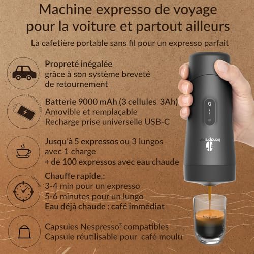 COMPACT ET ULTRA-PORTABLE : Handpresso Auto est la machine à café idéale en voyage. En voiture, en pleine nature ou sur la route des vacances, ce coffret réunit tout ce qu’il faut pour préparer un expresso exceptionnel partout, en toute décontraction. PROPRE ET BREVETÉE : grâce à son fonctionnement exclusif par retournement (brevet Handpresso), la machine prépare un café toujours propre et net . Idéale en voiture, elle vous accompagne partout pour un expresso toujours réussi. FACILE À UTILISER : sans fil et intuitive, elle fonctionne avec toutes les capsules expresso compatibles (Nespresso, L’Or, Carte Noire, Illy, Starbucks, Lavazza…) ou avec des capsules réutilisables pour café moulu. Ajoutez l’eau, insérez la capsule, appuyez : le café est prêt. Compacte et simple à nettoyer, la Handpresso Auto s’emporte partout. PERFORMANTE ET AUTONOME : avec sa pompe 19 bars et son réservoir 100 ml, préparez un expresso crémeux (40 ml) en 3-4 min ou un lungo (80 ml) en 4-5 min. Sa batterie amovible offre jusqu’à 5 expressos ou 3 lungos par charge, avec un rechargement rapide par UBC/C en 2h30. MODE EXPRESS ÉCO : avec de l’eau chaude (thermos ou bouilloire), lancez l’extraction instantanément par double-clic. Ce mode permet jusqu’à 100 cafés par charge. Avec 100 ml d’eau, préparez deux expressos d’affilée pour partager le plaisir. DURABLE ET RESPONSABLE: depuis 2008, Handpresso, pionnier français du café portable, conçoit des cafetières portables fiables et réparables (batterie amovible, pièces disponibles). Conformes aux standards des grands constructeurs automobiles, elles sont garanties 2 ans, avec un service après-vente assuré dans nos ateliers en France.