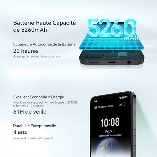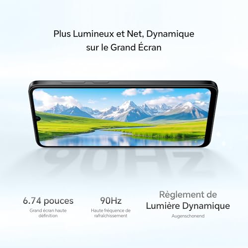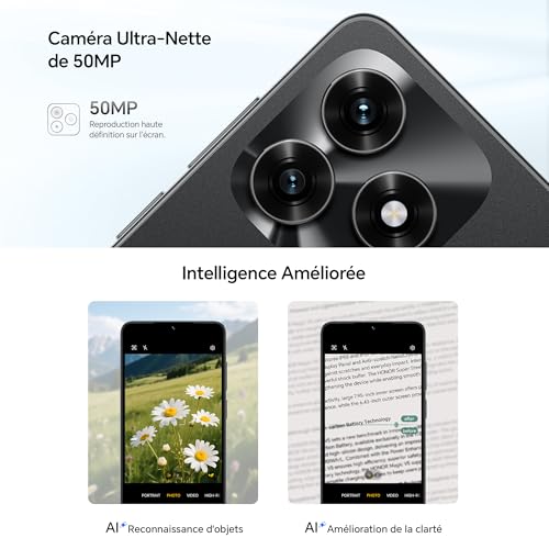 【Double appareil photo AI 50MP : photos nettes】Capturez moments avec détails pro via le système photo HONOR X5c Plus : 50MP principal arrière (f/1.8), 0.08MP auxiliaire et 5MP frontal pour selfies nets. L’AI booste les résultats : reconnaissance d’objets isole sujets/nettoie arrière-plans ; AI Sharpness garde textes/documents clairs. S’adapte auto…