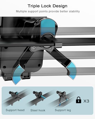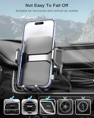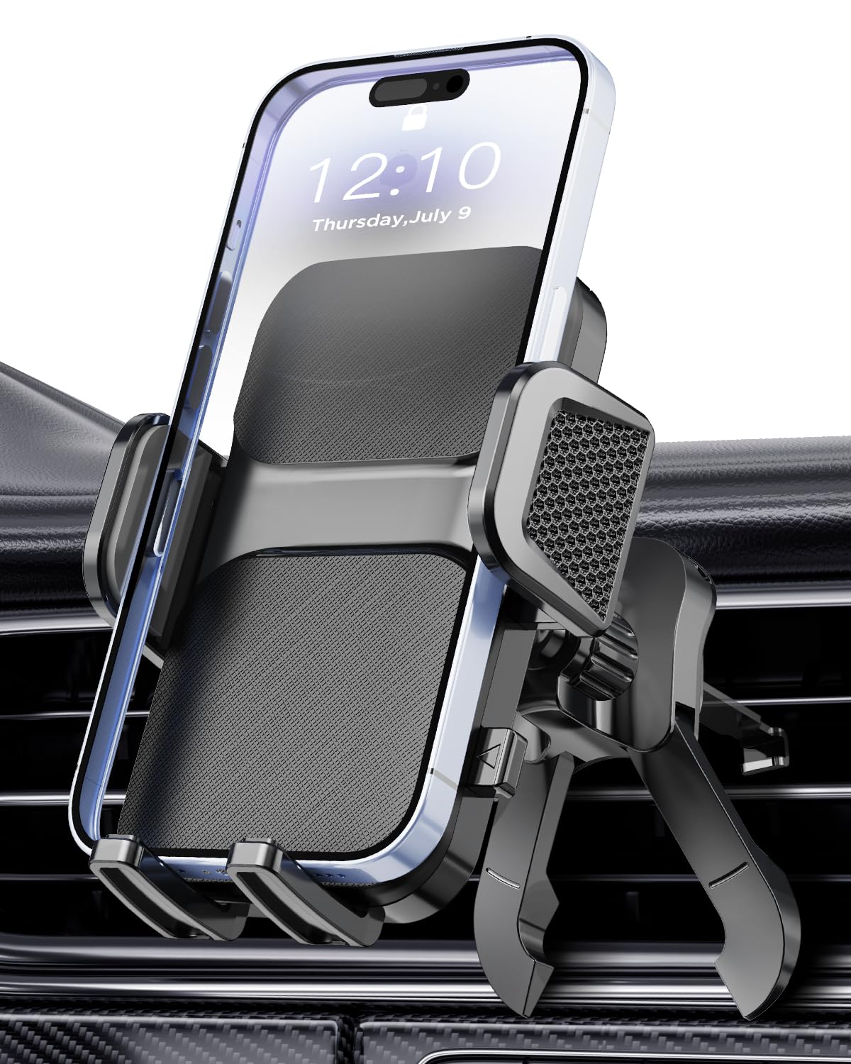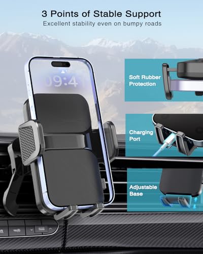 Stabilité à trois points avec pieds de support doubles : Ce support téléphone voiture est équipé d’un nouveau crochet renforcé amélioré et de 2 pieds réglables supplémentaires, formant un système de support triangulaire stable, qui peut être fixé plus fermement sur la sortie d’air tout en empêchant l’ailette de ventilation d’être soumise à une pression excessive. Il assure la stabilité de votre téléphone, même sur les routes cahoteuses et sinueuses, ainsi que sur les dos d’âne Protection intégrale : Les bras de serrage et les pieds de ce porte telephone voiture sont équipés de patins en caoutchouc souple pour une fixation optimale du téléphone et éviter les rayures. Le panneau est doté d’une rainure pour une meilleure dissipation de la chaleur. Le port de charge est situé en bas pour faciliter la recharge du téléphone Angle personnalisé : La rotule réglable à 360 degrés permet une orientation optimale, vous permettant de l’ajuster à l’angle idéal, vertical ou horizontal, idéal pour la navigation en voyage. Une fois que vous avez déterminé l’angle, serrez le collier à vis du socles de téléphone portable pour automobile pour fixer solidement le support en place Utilisation à une main : Un bouton de déverrouillage rapide est situé sur le côté du support portable voiture. Appuyez dessus pour ouvrir le bras de serrage, insérez le téléphone et poussez le bras de serrage pour le verrouiller. L’utilisation est pratique et rapide, et le téléphone s’installe et se retire d’une seule main S’adapte à la plupart des bouches d’aération : Ce accroche telephone voiture s’adapte aux véhicules dotés de fentes d’aération verticales ou horizontales, mais pas aux bouches d’aération circulaires en forme de tourbillon