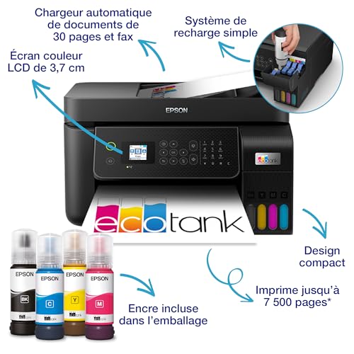 Dites adieu aux cartouches – EcoTank offre une impression simple aux particuliers et aux petites entreprises : les réservoirs d’encre ultra haute capacité sont facilement rechargeables et les bouteilles sont dotées d’un détrompeur pour ne plus se tromper de couleur en remplissant le réservoir Économies à long terme – Cette imprimante multifonction vous permet d’économiser jusqu’à 90 % sur les coûts de l’encre* et elle est livrée avec l’équivalent de jusqu’à 3 ans d’encre* – Un jeu de bouteilles d’encre permet d’imprimer jusqu’à 4 500 pages en monochrome et 7 500 pages en couleur*, soit l’équivalent de 72 cartouches d’encre* Application Epson Smart Panel – Cette application vous permet de contrôler votre imprimante à partir de votre appareil mobile* – Vous pouvez imprimer, copier et numériser des documents et des photos, mais aussi configurer, surveiller et dépanner votre imprimante, le tout depuis votre téléphone ou votre tablette Nombreuses fonctionnalités – Grâce à son écran couleur LCD de 3,7 cm, à son chargeur automatique de documents de 30 pages, à son fax et à son bac papier arrière de 100 feuilles ainsi qu’à des vitesses d’impression de 10 pages par minute*, vous pouvez effectuer rapidement plusieurs tâches en toute simplicité Flexibilité moderne – Grâce à son design compact et à sa connectivité complète Wi-Fi, Wi-Fi Direct et Ethernet, vous pouvez facilement intégrer cette imprimante multifonction à votre installation domestique ou professionnelle et imprimer depuis vos appareils mobiles, tablettes et ordinateurs portables* Technologie Zéro Chaleur – Grâce à la technologie Zéro Chaleur Micro Piezo, vous bénéficiez d’une consommation d’énergie réduite et vous avez besoin de moins de pièces de rechange – La tête d’impression est également préinstallée afin de simplifier l’installation de votre imprimante *Voir les notes de bas de page 1 à 15 sur la page Web dédiée à Epson EcoTank