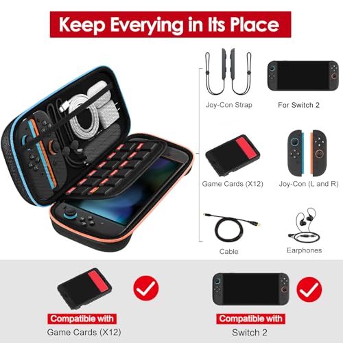 Protection durable et de haute qualité : Fabriqué en coque rigide EVA robuste et tissu Oxford imperméable, cet étui protège efficacement votre Nintendo Switch 2 contre les chocs, les rayures et les éclaboussures du quotidien. Parfait pour les déplacements : Élégante et compacte, cette housse de transport est idéale pour vos déplacements quotidiens. Gardez votre console en sécurité où que vous alliez. Doublure intérieure douce et protectrice : L’intérieur est conçu avec un matériau doux qui prévient les rayures et maintient solidement la console en place sans mouvement. Grand espace de rangement pratique : Une poche en filet zippée permet de ranger des accessoires comme un câble de charge, des écouteurs ou 2 Joy-Con supplémentaires. 12 emplacements sont prévus pour vos cartes de jeu préférées. Conçu sur mesure pour la Switch 2 : S’adapte parfaitement à la console Nintendo Switch 2 avec ses deux manettes Joy-Con attachées (non compatible avec le dock ou la manette Pro). Dimensions : 30 x 15,5 x 6 cm.