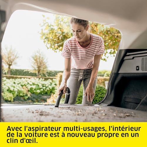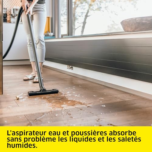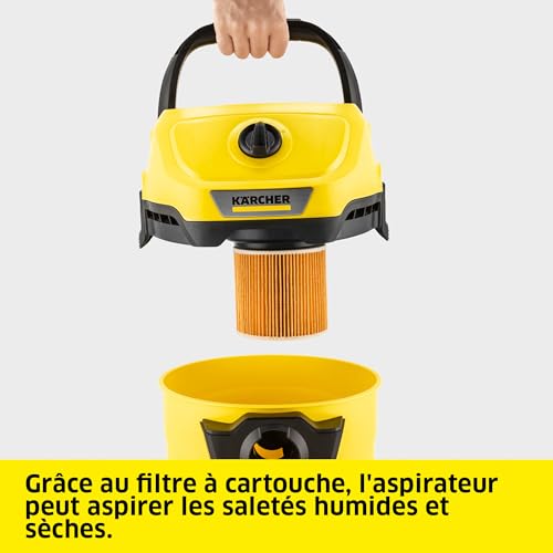 Aspirateur eau et poussières : sa puissance de 1000 W permet d’aspirer facilement les particules fines et les grosses saletés ; la fonction de soufflage débarasse facilement les feuilles ou copeaux Aspirer l’humidité sans changer de filtre : le WD 3 V-17/4/20 est équipé d’un filtre à cartouche ; il permet d’aspirer simultanément les saletés sèches et humides sans devoir changer le filtre Équipement confortable : l’aspirateur est équipé d’une cuve de 17 L en plastique robuste, d’un flexible d’aspiration (2m) et de rangements pour les accessoires et le câble d’alimentation (4m) Appareil polyvalent : l’aspirateur eau et poussières convient pour le nettoyage des sols dans la maison, le jardin ou l’atelier, mais aussi pour le nettoyage intérieur des voitures Livraison : l’aspirateur eau et poussières WD 3 V-17/4/20 Kärcher, un filtre à cartouche, un sac filtrant en non-tissé, une buse de sol, une buse pour fentes, un flexible et deux tubes d’aspiration