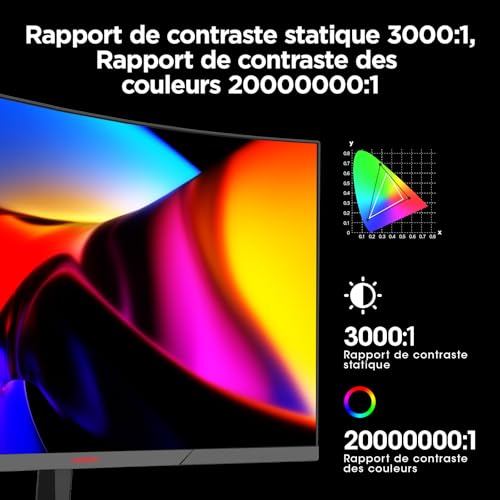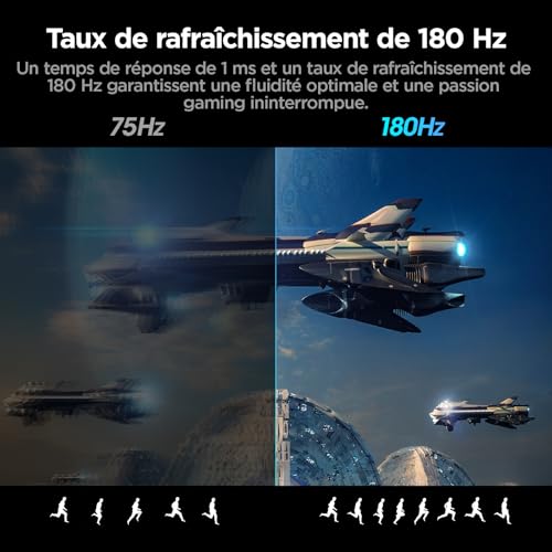 [Courbure 1500R immersive] Le moniteur de jeu KOORUI 24 pouces offre un impressionnant écran courbé 1500R qui vous immerge dans votre expérience de jeu ; La courbure douce vous offre une expérience visuelle captivante et réaliste [Reproduction des couleurs vives] 20000000:1 Rapport de contraste des couleurs et 3000:1 rapport de contraste statique, faites l’expérience d’une précision des couleurs impressionnante avec une ; Ainsi, vos jeux, films et images sont vivants et colorés [Connectivité et audio faciles à utiliser] L’écran 24 pouces dispose de connecteurs HDMI 2.0 et DP 1.2 pour 1080P+180HZ, pour une connexion flexible et polyvalente à vos appareils [Expérience de jeu fluide] Avec un taux de rafraîchissement de 180Hz et un temps de réponse extrêmement rapide de 1ms (MPRT), ce moniteur de PC de jeu prend également en charge la technologie Free-sync pour un gameplay encore plus fluide ; les modes de jeu RCG, FPS et RPG offrent des réglages optimaux pour différents environnements de jeu et facilitent la visée dans les jeux de tirs [Installation rapide et facile] Avec un support VESA de 100*100mm, c’est un bon choix pour économiser de l’espace sur le bureau