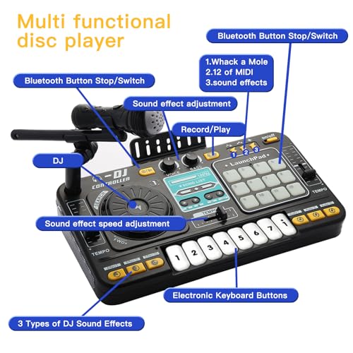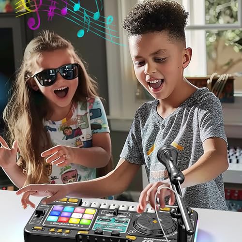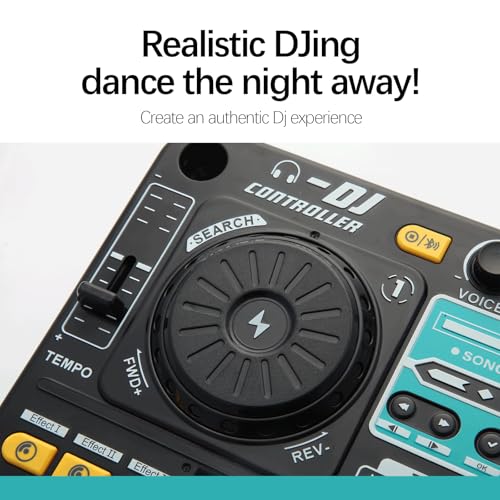 Mélangez et mixez avec des tourne-disques DJ, des chansons intégrées et plus de 3 000 combinaisons sonores Créez des effets sonores personnalisés et des étiquettes sonores à placer sur des pistes, puis enregistrez vos échantillons Ce mixeur DJ pour enfants est équipé de la technologie Bluetooth avancée, ce qui le rend facile à connecter à des appareils tels que les smartphones et les tablettes. Une collection massive de chansons pour enfants et de musique populaire se transforme instantanément en une bibliothèque musicale exclusive pour les enfants. Connectez-vous à votre propre musique via la technologie Bluetooth sans fil ou un câble audio ; reproduisez le mixage via le haut-parleur intégré ou écoutez avec le connecteur pour casque (excluant le lecteur de musique, le câble audio et les casques) Ajoute de la saveur musicale à travers les cris du microphone