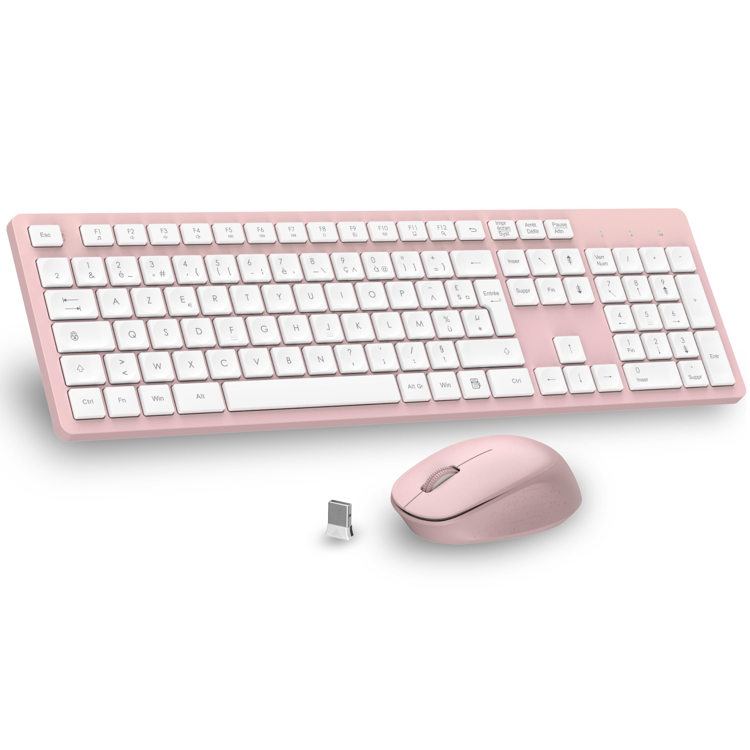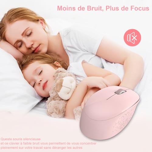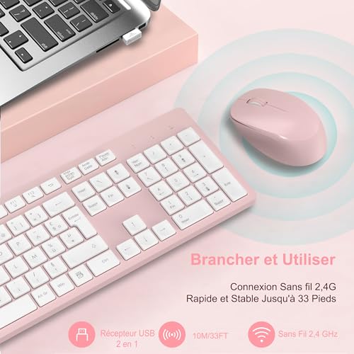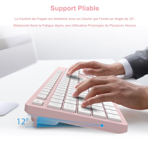 Connexion 2.4G Fiable & Installation Instantanée:Profitez d’une connexion sans fil stable et sans délai jusqu’à 10 mètres. Le petit récepteur USB 2-en-1 se branche et fonctionne immédiatement sur Confort Ergonomique & Design avec Support Intégré:Notre clavier est équipé d’un support réglable et de pieds antidérapants pour une frappe à l’angle parfait. La souris ergonomique soulage votre Frappe Silencieuse et Agréable:Tapez dans le calme ! Les touches silencieuses et low-profile de ce clavier AZERTY français offrent une expérience de frappe fluide et discrète, parfaite pour le Autonomie Exceptionnelle jusqu’à 12 Mois:Oubliez les soucis de batterie ! Le clavier fonctionne jusqu’à 6 mois et la souris jusqu’à 12 mois sur une seule pile. Le mode économie d’énergie et Format Pleine Taille avec Raccourcis Pratiques:Avec son pavé numérique complet et ses 12 touches multimédias raccourcies (réglage du volume, calculatrice, etc.), ce clavier full-size vous garantit