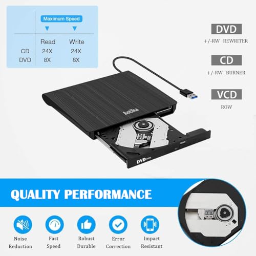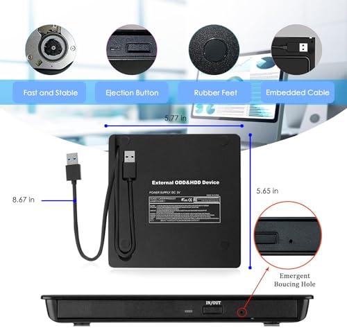 Technologie USB 3.0 améliorée:Interface USB 3.0 haute vitesse améliorée, assure une vitesse de transmission de données plus stable et plus rapide (jusqu’à un maximum de 5 Gbit/s). La version USB 3.0 améliorée a une tolérance aux pannes plus forte. Aucun programme pilote ou alimentation supplémentaire requis, entièrement alimenté par les ports USB (si le port USB de l’ordinateur a une faible puissance, une source d’alimentation externe est alors nécessaire). Haute vitesse:Adopté une technologie de gravure intelligente unique, ce lecteur CD-RW prend en charge les DVD R, DVD-R, CD-ROM, DVD-ROM, CD-R, CD-RW. Vitesse de lecture DVD maximale 8X ; vitesse de lecture CD maximale 24X et vitesse de gravure CD maximale 8X Facile à utiliser:Plug and Play. Le lecteur DVD externe est alimenté par le port USB. Aucun pilote ni alimentation externe n’est nécessaire. Branchez-le simplement sur votre port USB et le pilote DVD sera détecté. Le lecteur DVD USB 3.0 est un compagnon idéal pour les ordinateurs sans lecteur interne. Vous pouvez graver des fichiers, installer des logiciels et créer un CD de sauvegarde. Large compatibilité:- Les lecteurs de CD DVD pop-up sont adaptés à Windows XP/Vista/7/8/10, toutes les versions de MAC OS. Il est spécialement conçu pour Apple HP Dell Lenovo et autres, Surface/notebook (le port USB a une situation de faible puissance, veuillez utiliser une source d’alimentation externe prise en charge pour fonctionner), ordinateur portable et de bureau sans matériel de lecteur. Conception de câble intégré de lecteur pop-up portable, soignée et légère, vous pouvez mettre ce lecteur de CD/graveur/lecteur de DVD externe dans le sac de voyage ou sur votre bureau. Forte performance de travail, stable et haute vitesse de lecture et d’écriture.